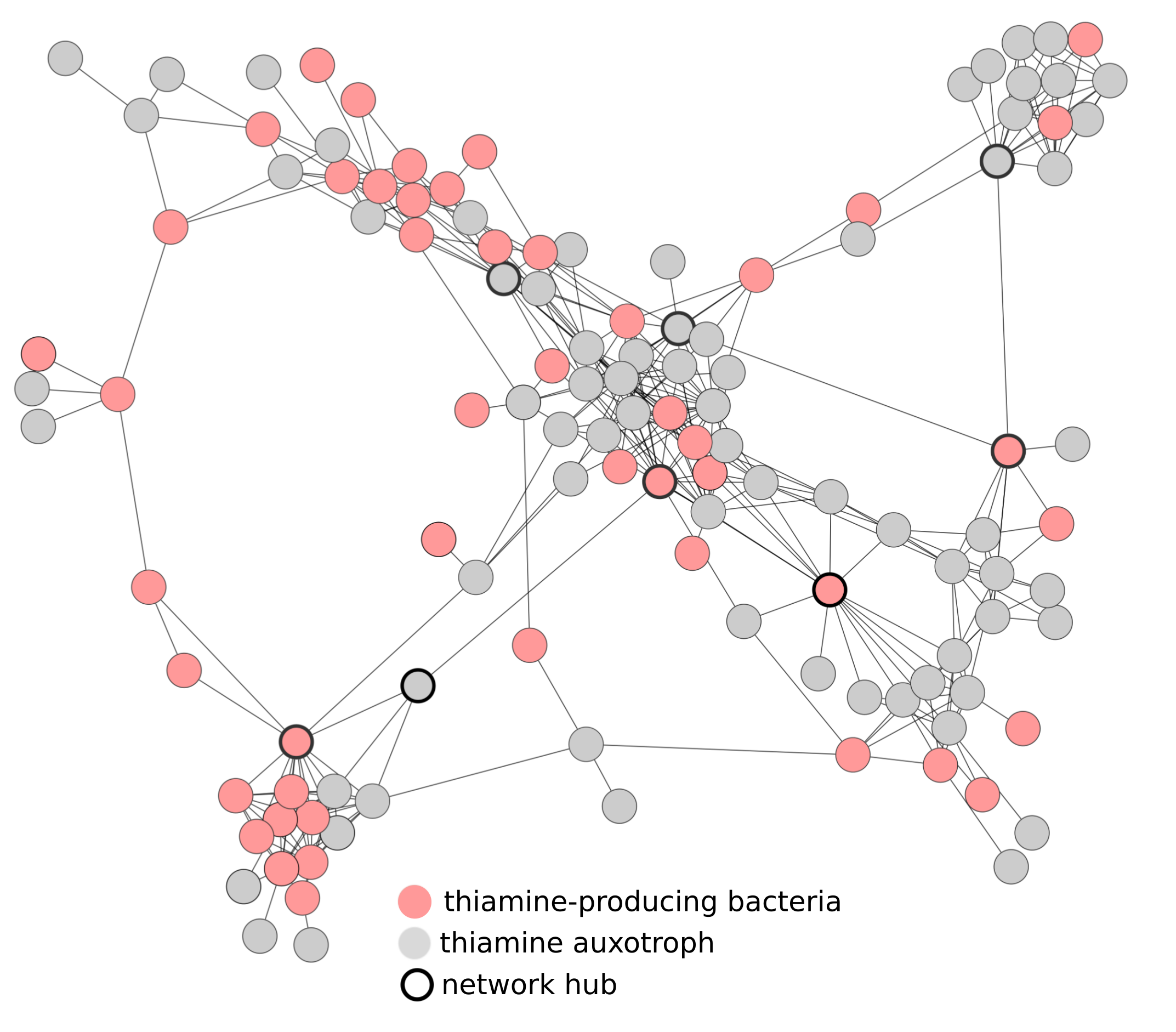 Considering the number of connections between vitamin-producing and auxotrophic bacteria (unable to produce a vitamin), we could estimate how important each organism within the network may be for the production of a given vitamin (Figure 3). Using this approach we identified a number of organisms that we predict to be important for supplying several B vitamins including thiamine, riboflavin, pantothenate and biotin to dependent organisms in their communities.