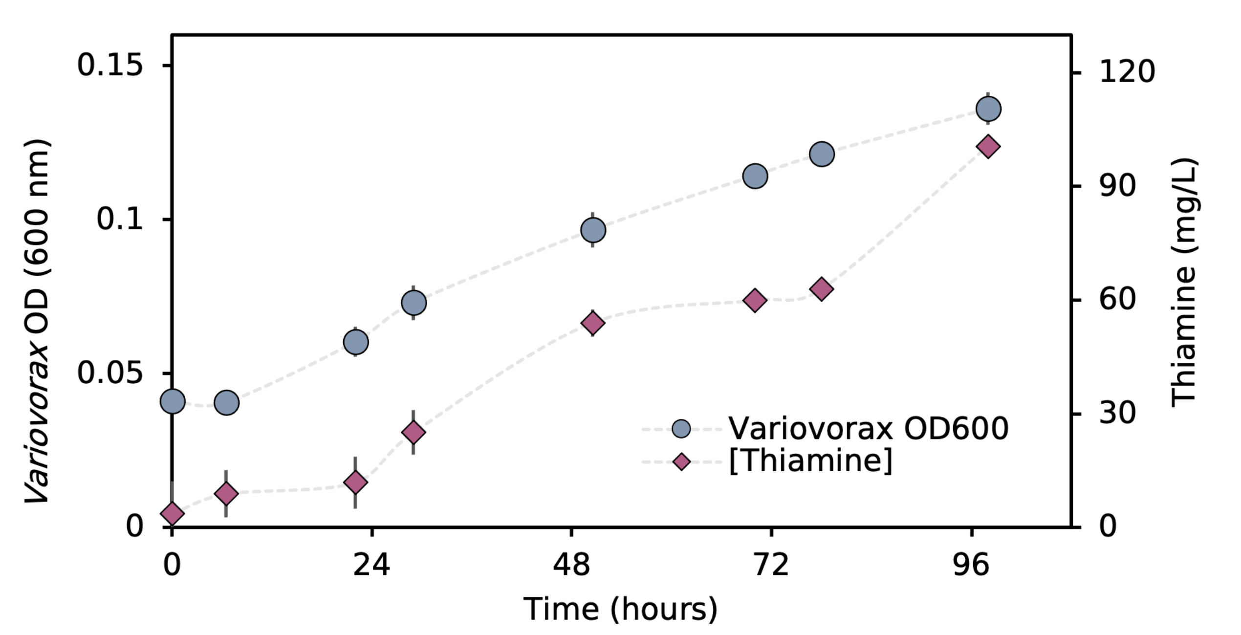 We then isolated many organisms from bioreactors performing thiocyanate degradation, including the predicted thiamine-producer, Variovorax. We first wanted to confirm that co-culturing Variovotrax with a thiamine auxotroph would boost the growth of the auxotroph. During our isolation campaign, we isolated a yeast, Cryptococcus, which was only able to grow in minimal media if thiamine was supplemented to the medium, making it an ideal biosensor to detect thiamine. Co-culturing these organisms together enabled Cryptococcus to grow to ~100-fold greater cell number than in pure culture, indicating that Variovorax was likely producing this vitamin. To confirm this, we then assayed the media during the growth of Variovorax and found it had produced ~100 mg/L of thiamine (Figure 4), far more than typical thiamine-producing bacteria (0.5-10 mg/L).