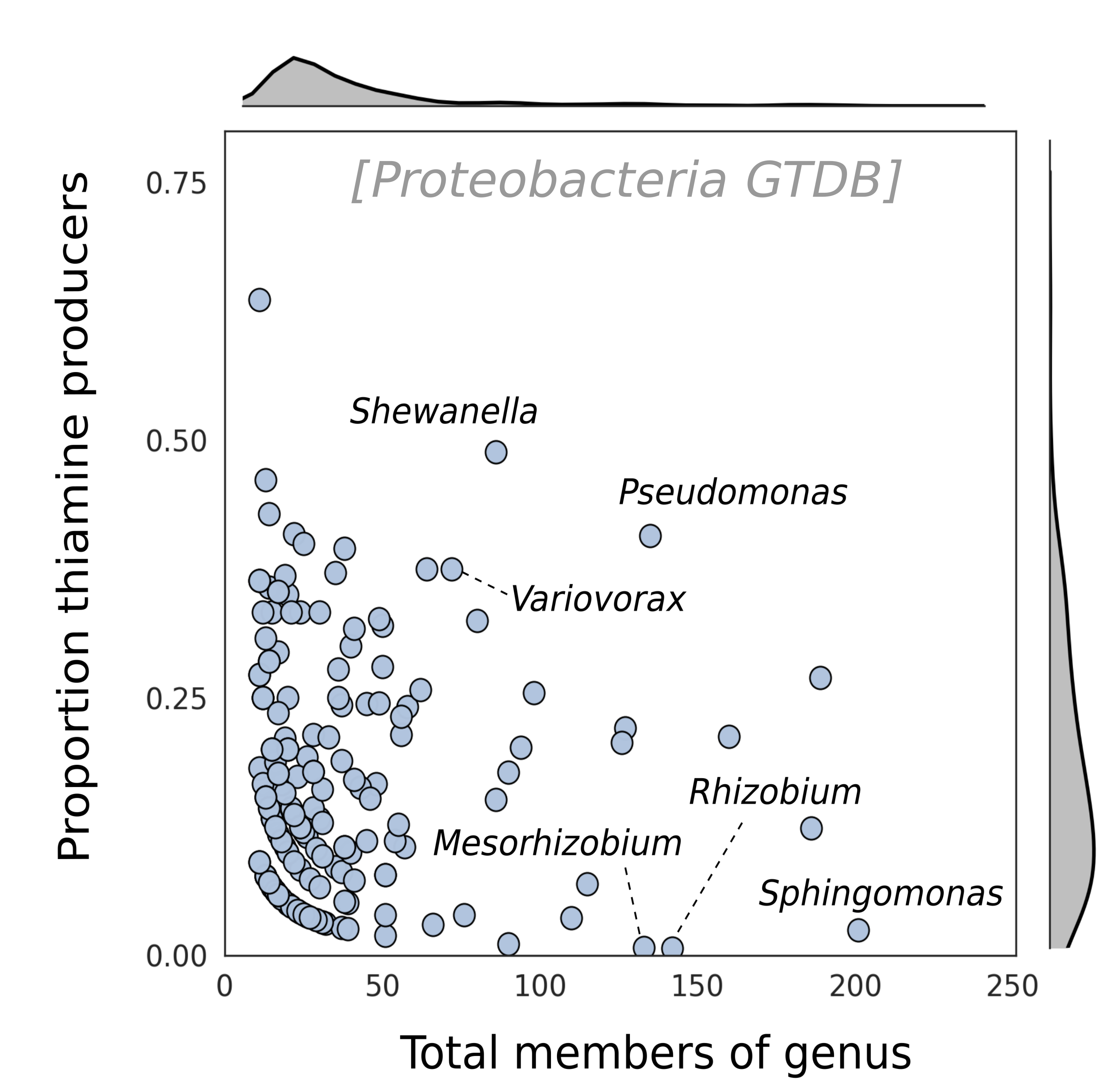 Bacteria seldom live alone, instead, they live within microbial communities where they exchange goods such as amino acids, nucleotides and vitamins. Exchanging these compounds reduces the number of compounds an organism needs to synthesize, and frees up time and energy for other important processes. Exchanging these metabolites can therefore be highly advantageous and is common across microbial communities. We can be sure that vitamins are commonly exchanged among bacteria because many vitamins are essential for microbial growth yet a large proportion of bacteria don’t encode the genes necessary for their production (Figure 1).