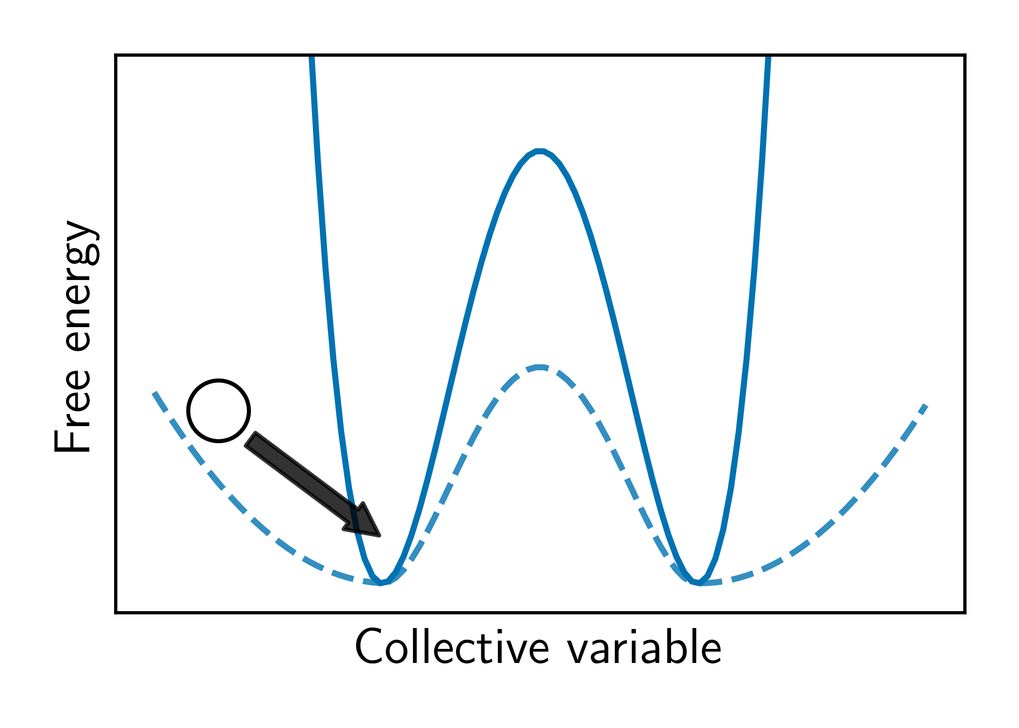 Resetting was previously shown to be particularly efficient for flat landscapes. Interestingly, MetaD is designed to overcome energy barriers by flattening the free energy surface (FES), as demonstrated in Figure 1. The unbiased FES of the system has a high barrier and narrow basins (solid line). Resetting is not necessarily expected to accelerate the transitions between the basins in this case. However, the external bias of MetaD produces an effective flatter FES with a lower barrier and broader basins (dashed line). This means that while MetaD accelerates the transitions, it also encourages excessive sampling of high-energy regions of phase space away from the barrier. The poorer the CV, the likelier it is for the system to "get lost" in these undesired regions. We noticed that this is exactly the scenario where SR thrives. This observation motivated us to study the combination of MetaD with resetting.