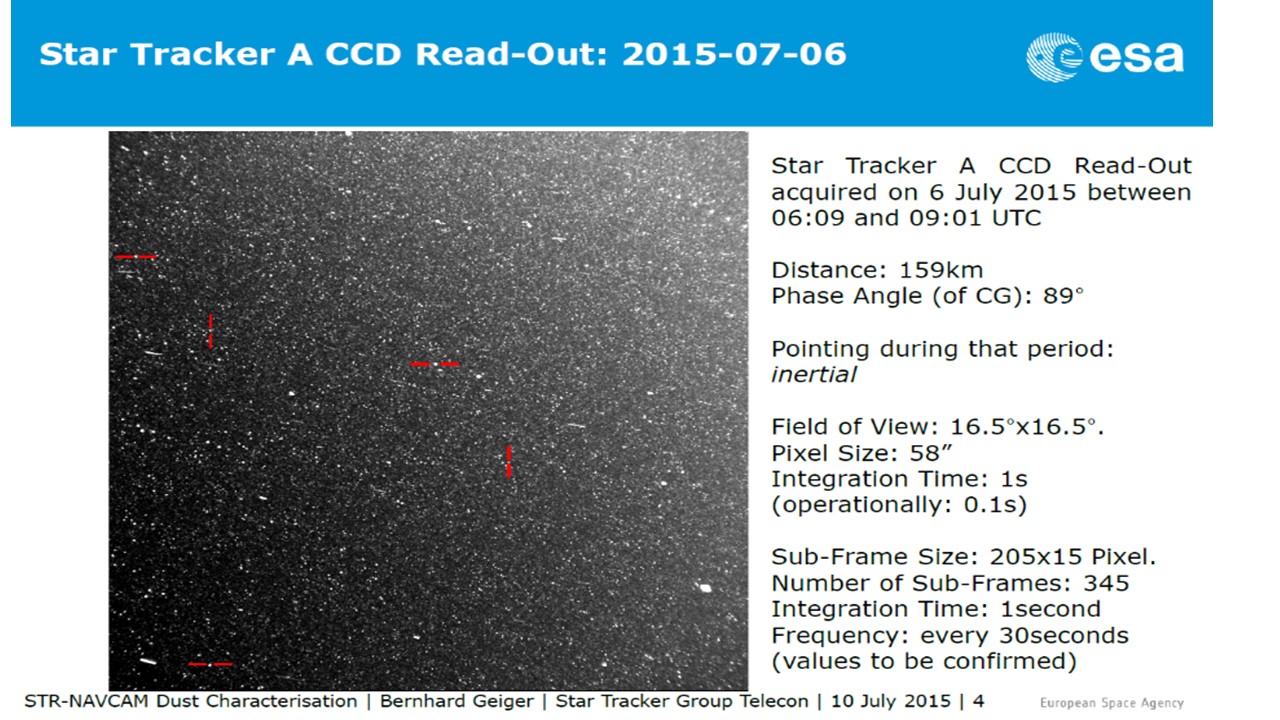On this star tracker image only the 5 red marked dots are real stars, all the other points are cometary dust.