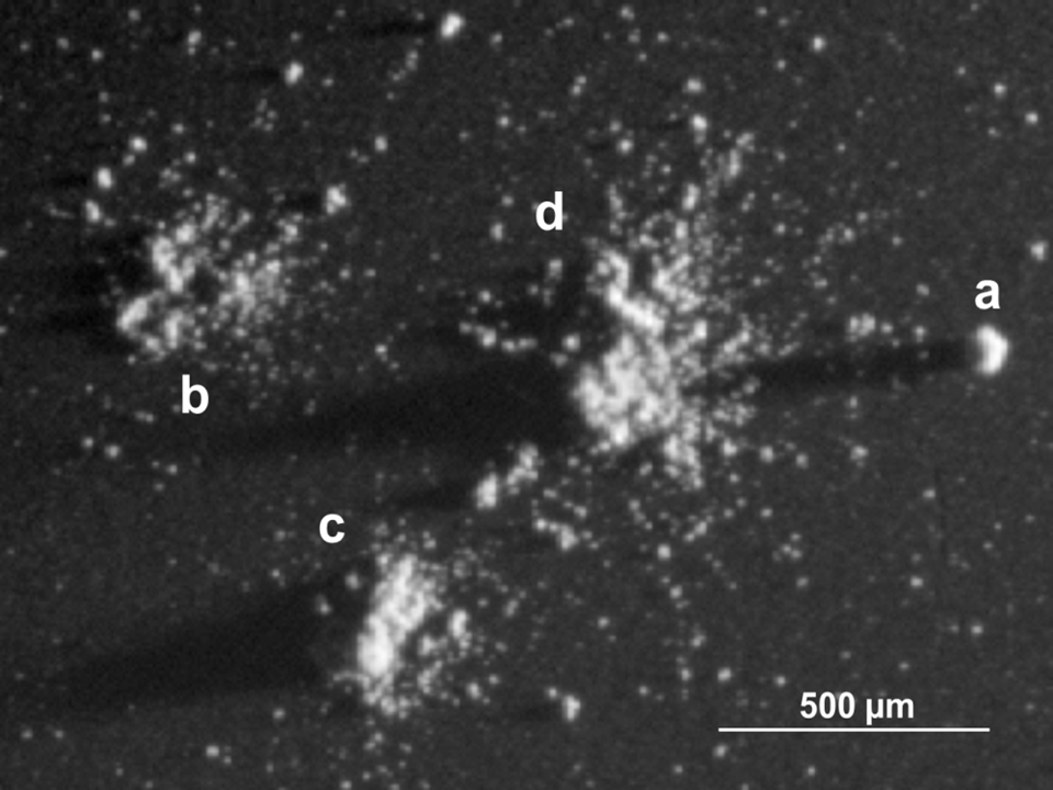 Diversity of comet dust particles seen on a small area on one single target of the COSIMA instrument onboard Rosetta. This image measures 2.5 mm across, with light coming from the right. Examples of compact particle (a), shattered cluster (b), a glued cluster (c) and a large rubble pile (d) are seen in this small area.