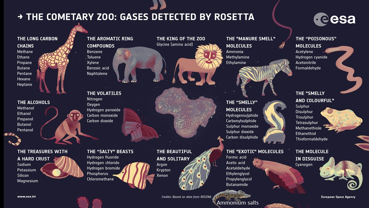 It means we now have a new animal in our existing zoo of molecules found in the coma of 67P. The ROSINA team decided that a salt water crocodile represents these salts best. And the nice result is that this detection probably solves the question of the depleted nitrogen in comets, found more than 30 years ago when the European Giotto mission encountered comet Halley.