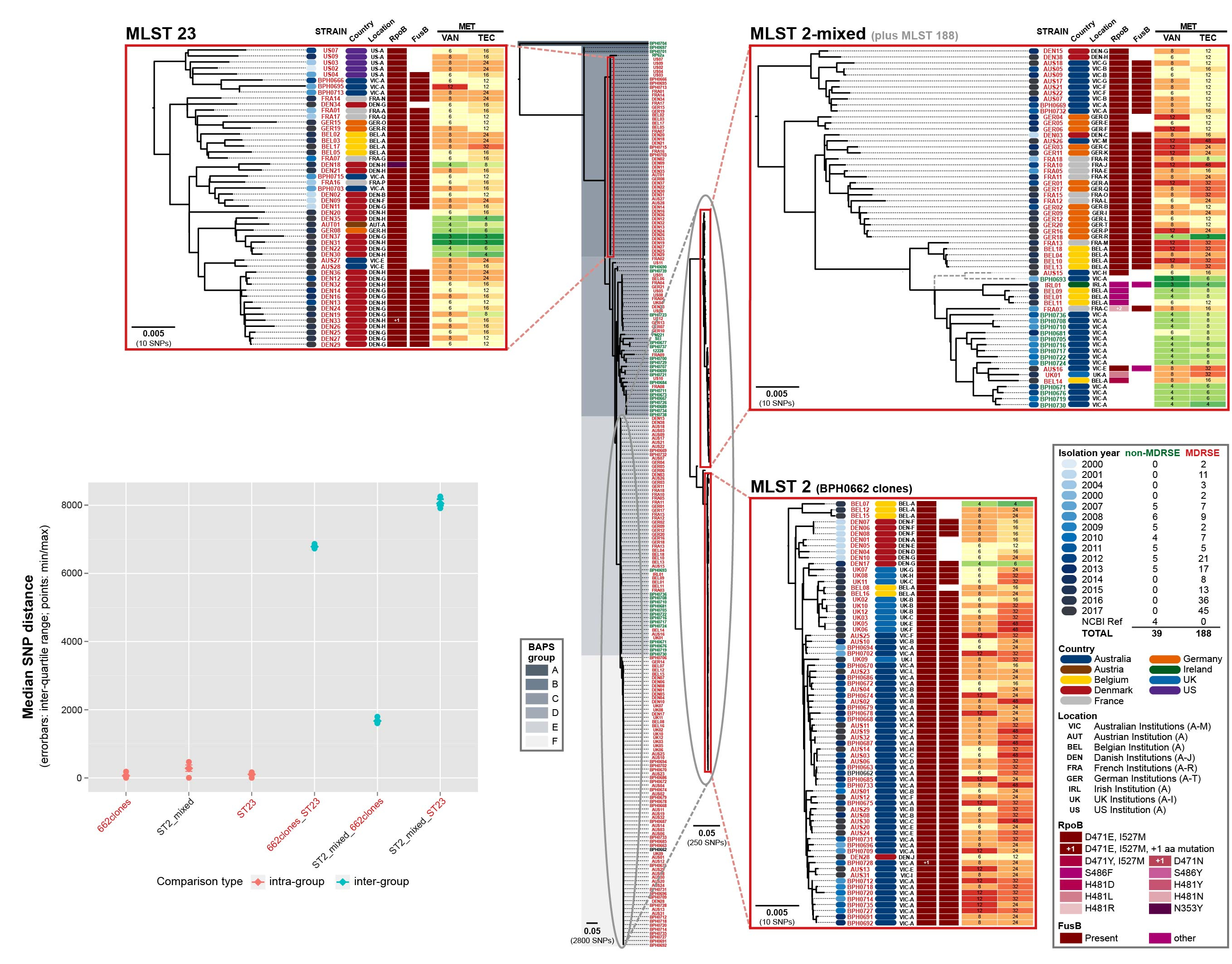 A dual substitution (D471E and I527M) in RpoB that causes high-level rifampicin resistance was identified as common to clones in the three lineages. Through allelic exchange, we were able to demonstrate that this dual RpoB mutation also caused cross-resistance to vancomycin. This suggests that combined use of vancomycin and rifampicin has likely contributed to increasing resistance to both these agents rather than prevention as intended. With standard treatments exhausted, only salvage drugs (for which evidence about clinical outcomes are limited and side-effects common) remain. Alarmingly, some of the European isolates in our study have also acquired resistance to the salvage antibiotics, rendering them potentially untreatable.