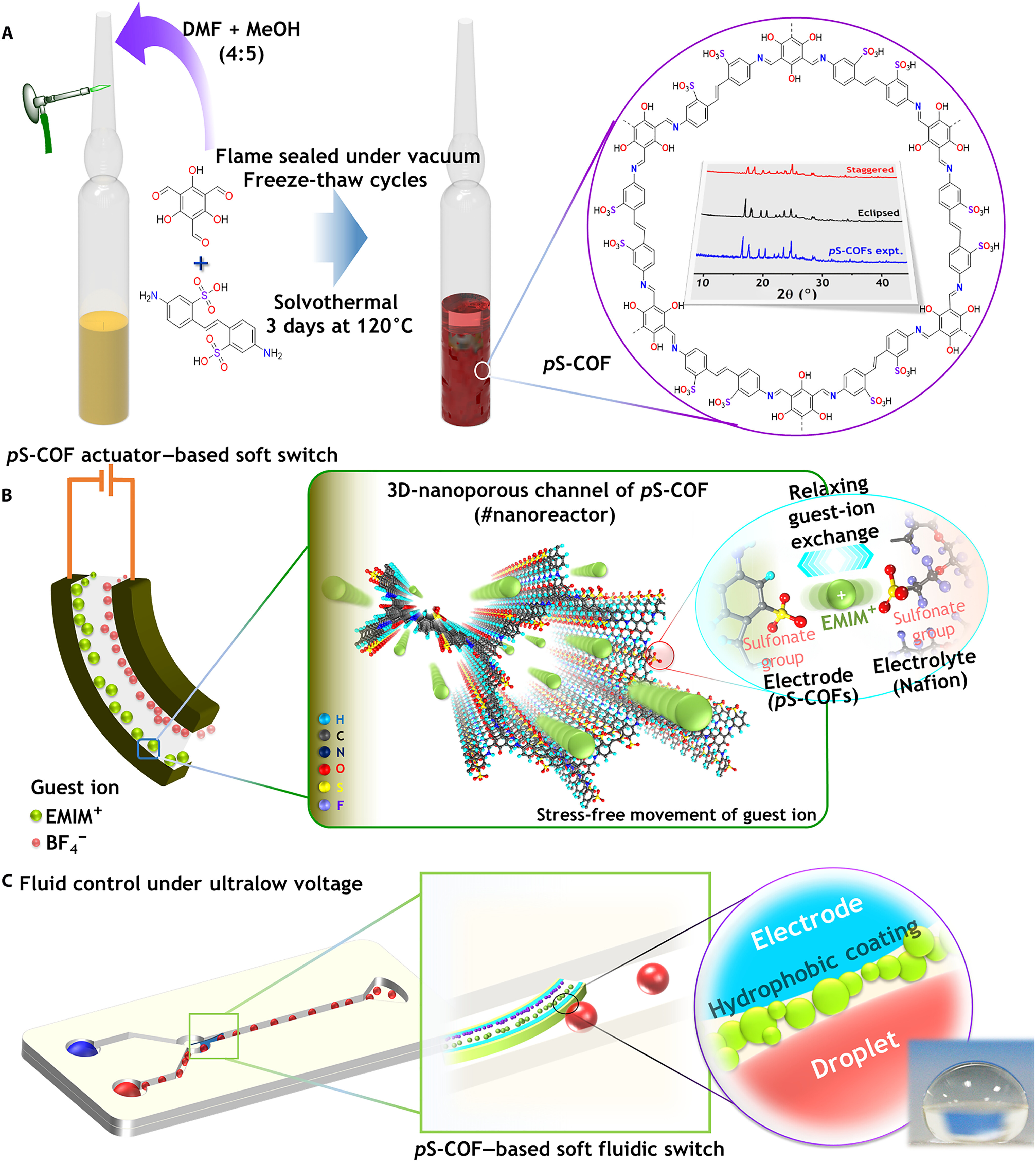 Herein, we report an electronically conjugated polysulfonated COF (pS-COF) for a common electrolyte-electrode host of electrochemical soft actuators. The electronically conjugated pS-COF is synthesized as an active electrode material to produce common surface sulfonate functionalities and facilitate the relaxing exchange of 1-ethyl-3-methylimidazolium (EMIM+) guest electrolyte cations embedded in Nafion. The structural authenticity and successful synthesis of the designed pS-COF are verified both experimentally and theoretically. The common surface sulfonate moieties of all-solid-state electrolyte-electrodes provide an easy and relaxing platform for the exchange accommodation of movable EMIM+ guest ions in an electrochemical environment. In addition, the electrode surface containing the 3D nanoporous channels of the crystalline pS-COF acts as a nanoreactor for the abundant stress-free movement of ions. Figure 1A illustrates the synthesis of polycrystalline pS-COFs with plausible chemical structures and shows the refined powder x-ray diffraction (PXRD) patterns obtained both experimentally and theoretically. Figure 1B schematically describes the ultralow-voltage–driven bending mechanism and basic configuration of the electroactive soft switch prepared from the as-synthesized pS-COF serving as an active electrode material. The fabricated electroactive soft switch was used to demonstrate the effective control of a fluid flow in a confined channel under an ultralow voltage (Fig. 1C). It is noteworthy that, unlike other actuators, the pS-COF–based soft switch exhibits the highest strain and force with an ultrafast response, which allows effective blockage of the target channel, leading to a unidirectional fluid flow. The superhydrophobic surface of the soft fluidic switch prevents the adhesion of liquid droplets and completely controls the fluid dynamics