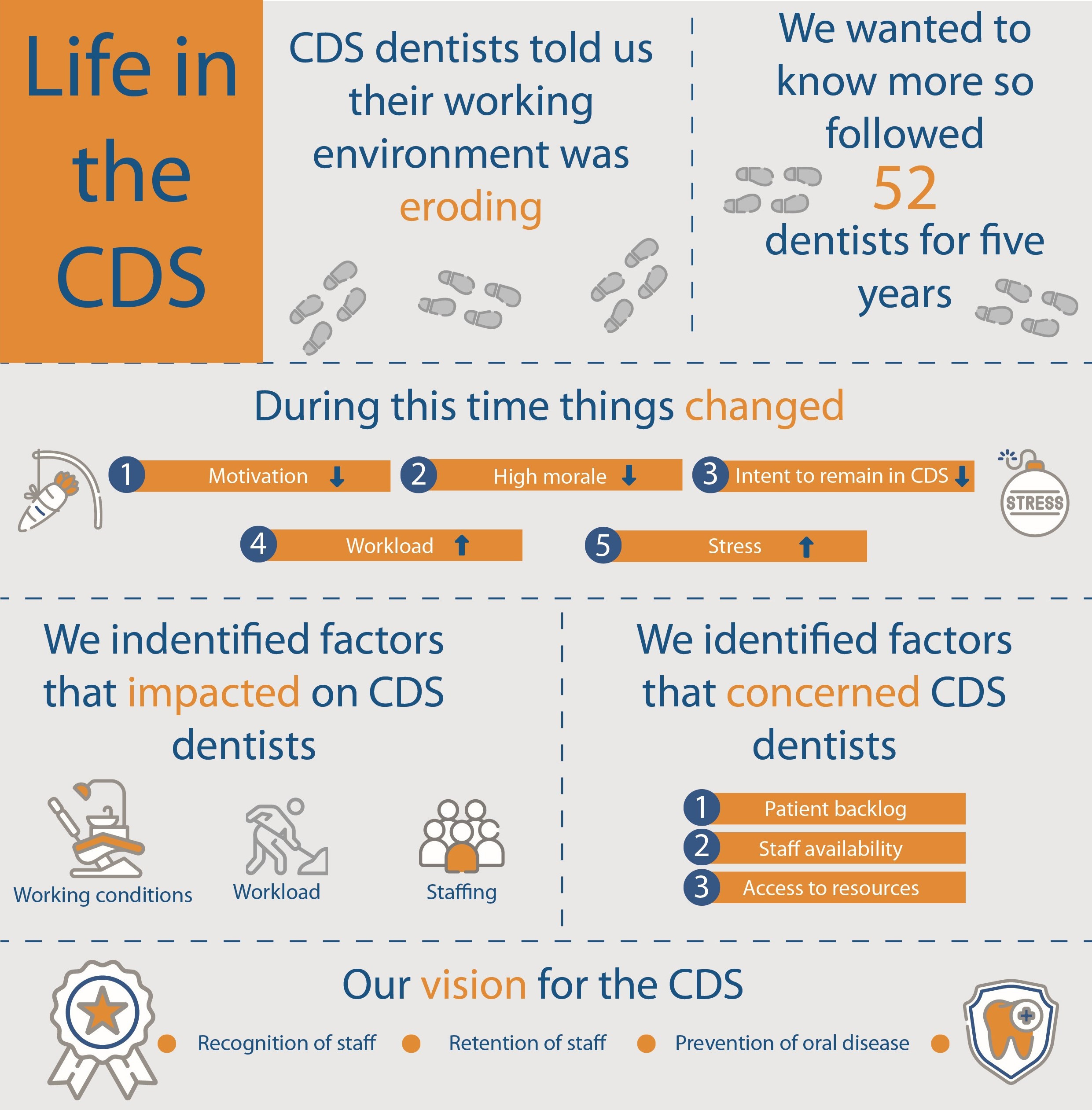 In 2017 we spoke to dentists working in the service that treats and cares for vulnerable patients including individuals with additional support, care or healthcare needs – the Community Dental Service (CDS). Dentists in the CDS work in clinics and hospitals, visit schools, conduct research, treat patients in their homes if they cannot get to a clinic and train young dentists. We asked these dentists about their work, their lives and the services they provide. They described a failing service, the accumulative effects of a continued lack of investment and the spill over in demand from high street dentistry. We were concerned, wanted to know more and wanted to understand how the healthcare landscape affected these dentists over a longer period. To learn more about it we spoke to them once a year for five years with our analytical study based on the data we collected.