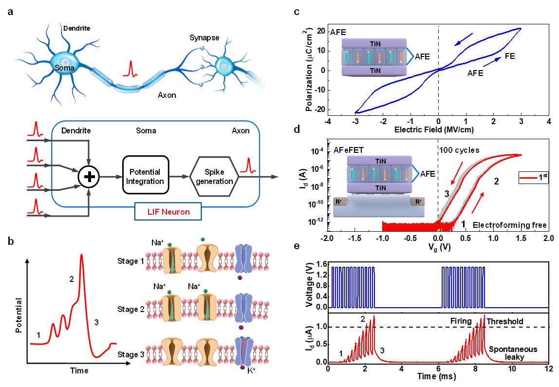 a The architecture and processing model of biological neurons. b The integrate and fire dynamics of a biological neuron. c The representative double hysteresis of anti-ferroelectric materials. d The typical transfer curves of the anti-ferroelectric transistors. e The continuous firing events of anti-ferroelectric transistor neurons.