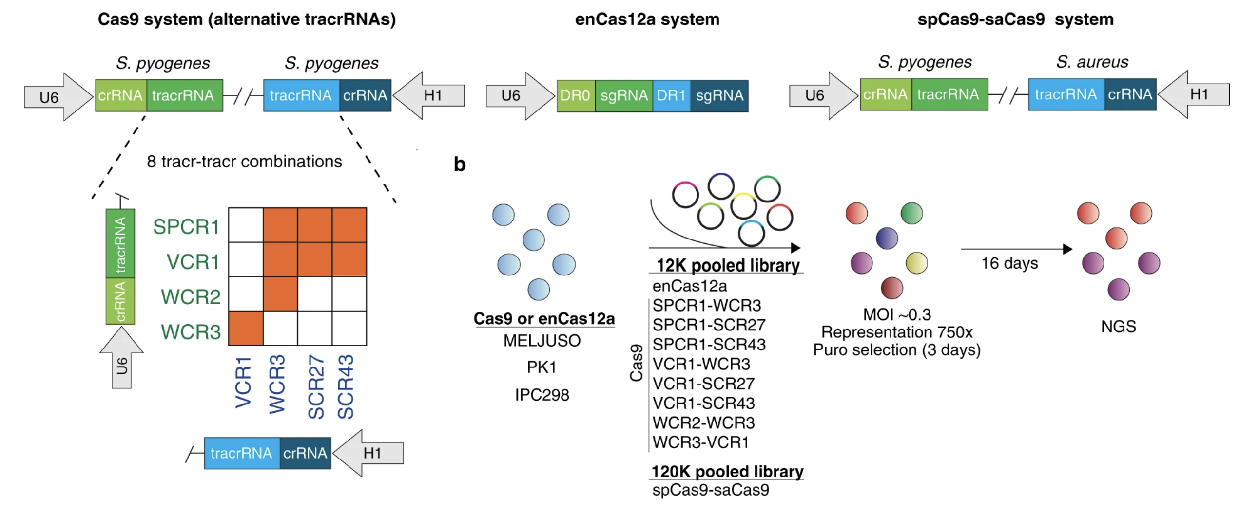 In our paper “Comparative optimization of combinatorial CRISPR screens”, we sought to compare these digenic CRISPR screens methods. To do this, we evaluated three CRISPR systems (spCas9-saCas9, enCas12a, and 8 combinations of alternative spCas9 tracrRNA sequences) (Figure 1).