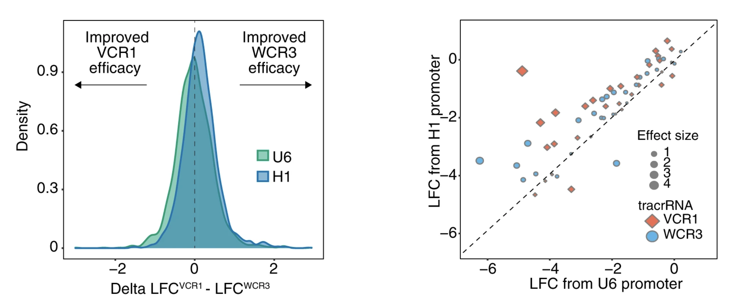 Left: Evaluation of tracrRNA effect calculated by the difference in Log-fold change (LFC) between sgRNAs (VCR1-WCR3 vs WCR3-VCR1) in IPC298. Right: Evaluation of the promoter effect by aligning the LFC from the U6 and H1 promoter.