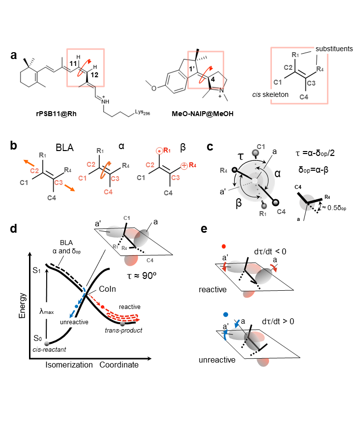 Figure 1. Structures and reactivity of systems under comparison. a) rPSB11 and MeO-NAIP structures and their common ethylenic framework and definition of the skeletal (C1, C4) and ethylenic (R1, R4) substituents. Notice the consistent out-of-plane counterclockwise (CCW) deformation in the two systems. b) Coordinates driving the photoinduced double bond isomerization: the skeletal bond-length-alternation (BLA), the double-bond twisting of the ethylenic fragment (α), dihedral describing the wag (β) of the ethylenic substituents. c) Definition of τ, α, and δop, where τ is the dihedral defining the overlap between the p-orbitals (represented by the axis a and a') at C2 and C3, and δop is a convenient function of β describing the substituent wag relative to the molecule conjugated framework. d) Schematic illustration of the potential energy surfaces (PESs) of both the ground state (S0) and the excited state (S1) (in solid black line). The trajectory represented through the evolution of double-bond isomerization coordinates BLA, α, and δop (in dashed lines). The red and blue circles represent unreactive and reactive decay points, respectively. e) Relationship between orbital overlap, dτ/dt phase, and reactivity. A reactive event can be associated with the π-bond breaking (dτ/dt < 0), and the unreactive event is associated with the π-bond making (dτ/dt > 0), defined by the p-orbitals (a and a') overlap at decay.