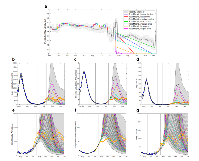 First, the difficulties of making detailed long-term predictions due to uncertainties in both vaccine and disease parameters (especially in the early stages of vaccine roll-out or a novel variant), as well as in human behaviour. Estimates of the effects of vaccination and the level of protection it infers against severe disease effects, infection and transmission became progressively more confident over time, as data accumulated. We also gained an increasing understanding of social behaviour; how precautionary behaviour increases rapidly in response to imposed restrictions or perceived risk, and the gradual decline in social caution at other times, as individuals seek a return to normality during periods of relative stability. Some significant behavioural anomalies would always remain impossible to predict however, such as the dramatic increase in mixing in late June/July 2021 due to the UEFA European Football Championship, and the later increased isolation caused by the ‘pingdemic’.