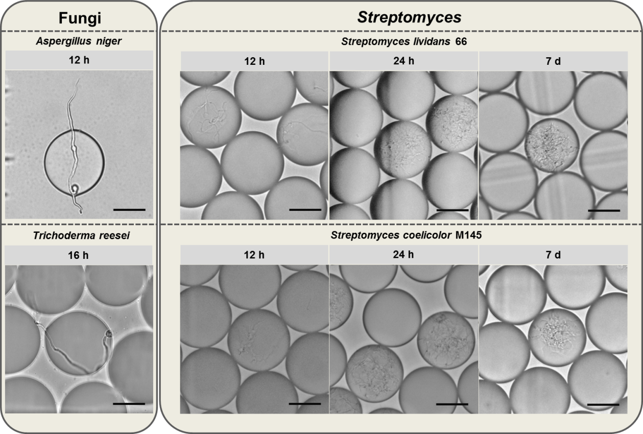 Fig. 1. Fungi- (Aspergillus niger and Trichoderma reesei) and Streptomyces-containing (S. lividans 66 and S. coelicolor M145) droplets after different periods of cultivation. Scale bar: 50 μm.
