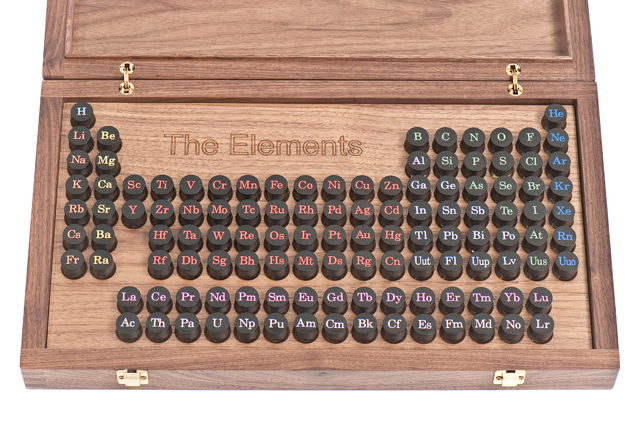 Each element is presented in a clear glass vial with its chemical symbol engraved on the lid, which is permanently sealed for safety. Some of the more toxic elements, like arsenic and mercury, have a secondary containment vessel within the tube for extra protection.