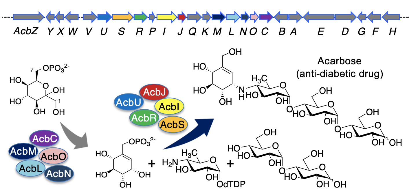 Acarbose is an α-glucosidase inhibitor used clinically to treat type 2 diabetes. This compound was first isolated from bacteria in the 1970s and approved to be used as an anti-diabetic drug in the US and Europe in the 1990s. As type 2 diabetes mellitus cases around the world have been steadily increasing, the need of acarbose and other antidiabetic drugs has also increased. However, despite its significant therapeutic importance, how this bioactive compound is made in bacteria was not clearly understood. Over the past four decades, several research groups have attempted to decipher the biosynthetic pathway to acarbose, but only the first half of the pathway was known. Elucidating the biosynthetic pathway to this highly polar pseudooligosaccharide appeared to be very challenging. Therefore, when I was suggested to work on this project by my postdoctoral mentor, Prof. Taifo Mahmud, I experienced emotions of honor and horror at the same time.