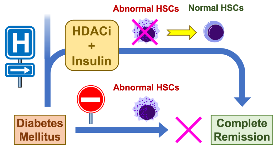 Until now, it has been believed that once diabetes mellitus develops, it never fully recovers. In this study, we demonstrated that persistent hyperglycemia generates hematopoietic stem cells with abnormal histone deacetylase expression in the bone marrow and that cells derived from these cells migrate to the islets and inhibit β-cell regeneration (Road with No-Entry). Both histone deacetylase inhibitor (HDACi) and insulin treatment were simultaneously applied to these abnormal cells to prevent the development of newly formed abnormal stem cells (Road with the hospital). As a result, the β cells of the STZ mice regenerated and their diabetes went into complete remission.
