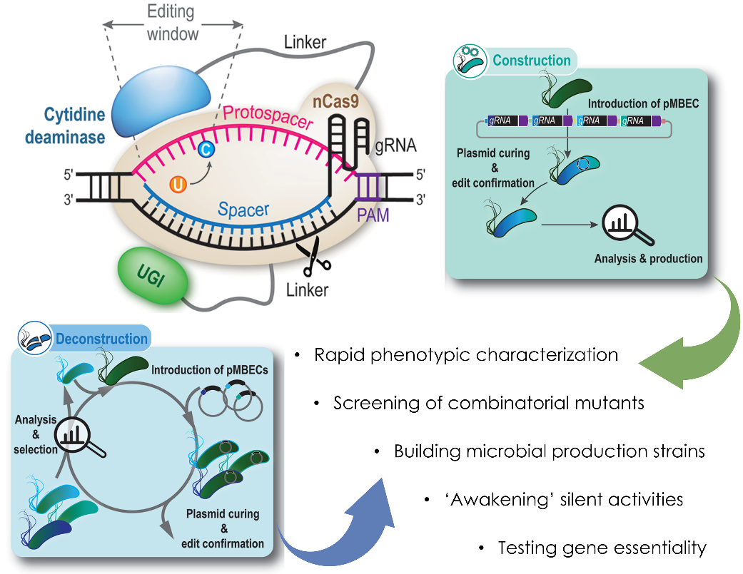 The ever-expanding CRISPR-Cas toolbox is arguably the most widely used gene and genome-editing tool across biological systems (both prokaryotic and eukaryotic), and these approaches have found broad applications in both basic research and biotechnological applications, including biomedicine and sustainable chemical production1,2. Among other purposes, intense ongoing research aims at engineering CRISPR-Cas9 proteins with enhanced efficiency and accuracy for precise genome editing or to establish specific base modifications. These exciting developments have provided the scientific community with tools and protocols for microbial engineering, yet some limitations still stand on the way towards wide application of the cognate technologies. For instance, metabolic engineering applications based on non-traditional bacterial hosts, e.g., Pseudomonas species3, has not been developed to the extent currently seen in other microbes—as the available toolset had been mostly tailored for model organisms. In an attempt to mitigate these practical constraints, we have developed a widely-applicable genome engineering toolset for Gram-negative bacteria (with a focus on their use to manipulate Pseudomonas species)4. The challenge included the modification of a CRISPR base editor such that it can enable single-nucleotide resolution manipulations (i.e., C·G→T·A) with >90% efficiency in a broad-host-range format.