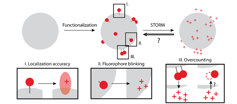 Figure 2|Creating a model for dSTORM-mediated analysis of functional group distribution. Schematic depiction of the steps involved in the observation of fluorophore patterns on a spherical nanoparticle. Fluorescent dyes (red spheres) are, either chemically or physically, grafted to the nanoparticle (grey sphere) according to an unknown spatial distribution. The collection of localizations (red crosses) acquired during subsequent dSTORM imaging does not yield this spatial distribution exactly, due to a finite localization accuracy (I) and blinking of the dyes (II), leading to overcounting artefacts (III).