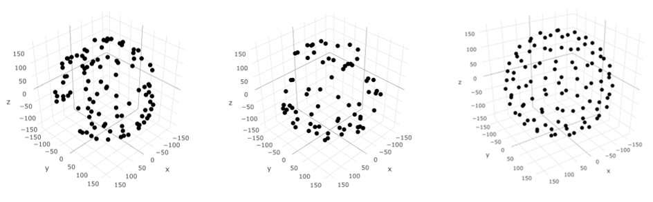 Figure 1|Functionalized spherical nanoparticles. Three spheres which are computer-based functionalized. Two spheres are randomly functionalized (realizations of a Poisson point process), while the remaining one is non-randomly functionalized.