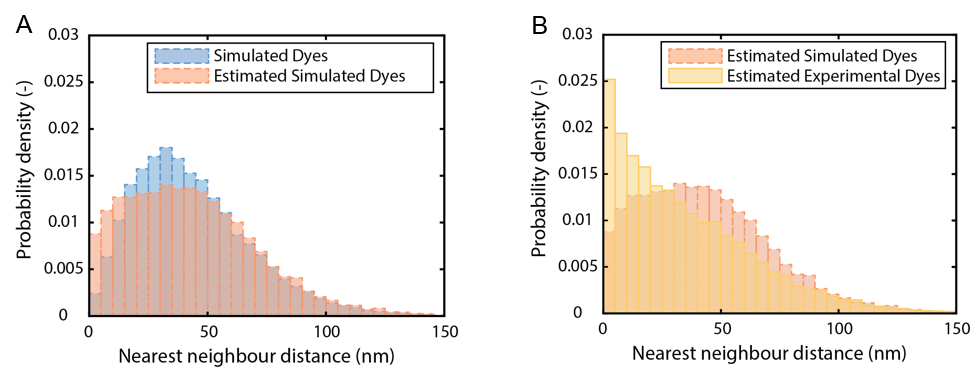 In our recently published work we study homogeneity of fluorescent molecules on spherical nanoparticle beads using direct stochastic optical reconstruction microscopy (dSTORM) measurements. We developed a mathematical model to describe the dSTORM dynamics to efficiently recover the source locations. Additionally, the model has been used to create computer-generated synthetic dSTORM measurements of homogeneously functionalized nanoparticles that can be used as a comparison. For these simulated beads we know the true source locations and can thus verify whether our algorithm accurately recovers these locations from the (simulated) signals. More specifically, to study homogeneity, we are interested in characteristics like the nearest-neighbor distance (NND) of functional groups. We were able to appropriately recover the NND distribution of the (simulated) homogeneously functionalized particles (Figure 3A). Thereafter we derived the NND distribution of the experimental beads of interest and compared these to the distribution as expected under the assumption of homogeneously functionalization (Figure 3B).