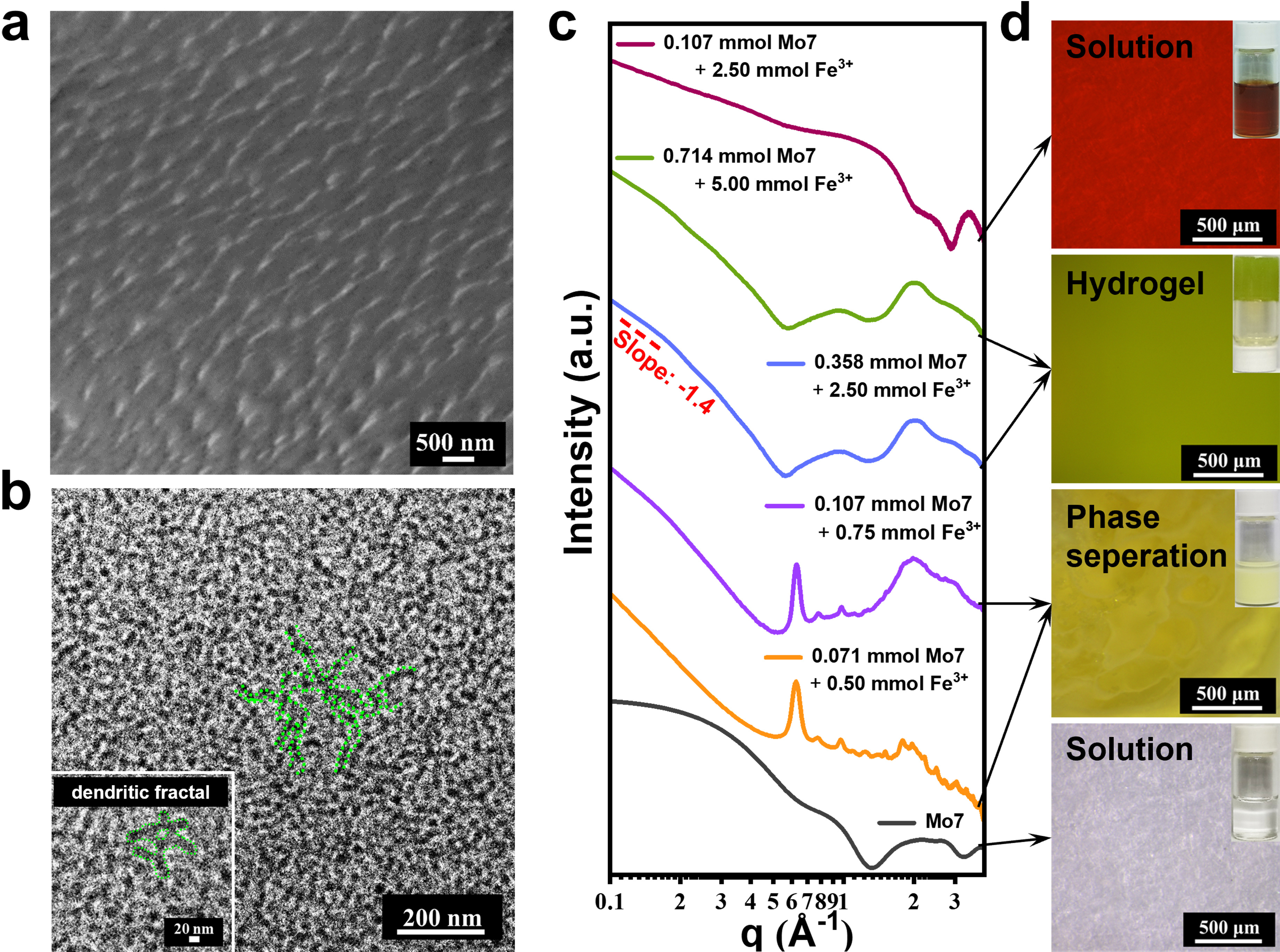Fig. 3 The morphology change of assembles in Mo7-Fe system. (a) Cryo-SEM images and (b) cryo-TEM images of Mo7-Fe hydrogel with a Mo7/Fe3+ molar ratio of 1:10, indicating the formation of branched structures in the Mo7-Fe gel networks. (c) SAXS spectra monitoring the gelation process with different molar ratios of Mo7/Fe3+. (d) In situ optical microscopy of the aggregates formed by Mo7 and Fe3+ in aqueous solution.