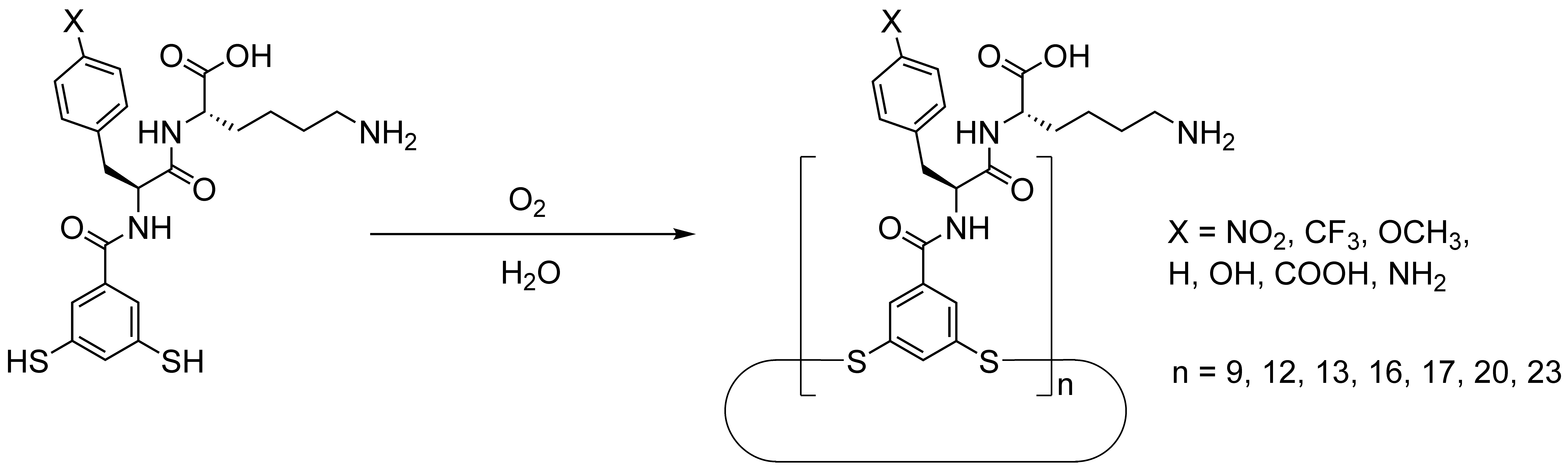 Our structural survey started with a dipeptide featuring a phenylalanine and a lysine amino-acid residue, appended with an aromatic dithiol at the N-terminus of the sequence (parent molecule, X = H in Figure 1). Given the vast combinatorial space available, our survey focused on the para position of the phenylalanine amino-acid residue. It quickly became clear that these building blocks did not behave as we envisioned. For the parent molecule and for the building blocks carrying hydrophobic substituents (4-NO2, 4-CF3, 4-OCH3) small oligoaryldisulfide rings were observed. A non-selective family of large cyclic oligomers was obtained for the tyrosine derivative (4-OH). This observation suggested that the hydrogen-bonding ability of the substituent impacts the overall amphiphilicity of the structures, which in turn favors the formation of large oligomers. By further increasing the propensity for hydrogen bonding (through the introduction of 4-NH2, 4-COOH, and 4-guanidine groups), Dr. Charalampos Pappas together with Dr. Bin Liu discovered the self- or template-instructed production of macromolecules having a perfectly uniform length. Depending on the peptide sequence, oligomers containing 9, 12, 13, 16, 17, 20 or 23 building block units formed with remarkable selectivity. These extraordinary and unexpected discoveries trump a previously observed folded structure composed of 15 identical chemical units2 and show the generality of the emergence of large-ring foldamers.