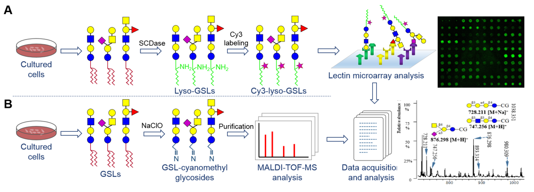 Figure 1. Flowchart of the comprehensive analysis of GSL glycans by lectin microarrays and MALDI-TOF MS from liver cell lines [6]. (A) Workflow of lectin microarray analysis of GSL glycans. (B) Workflow of detection of GSL glycans using MALDI-TOFmass spectrometry.