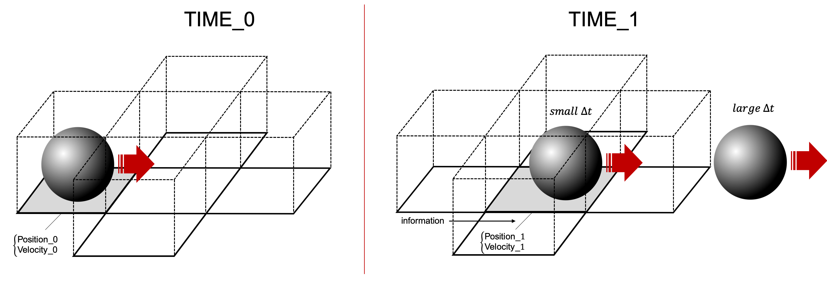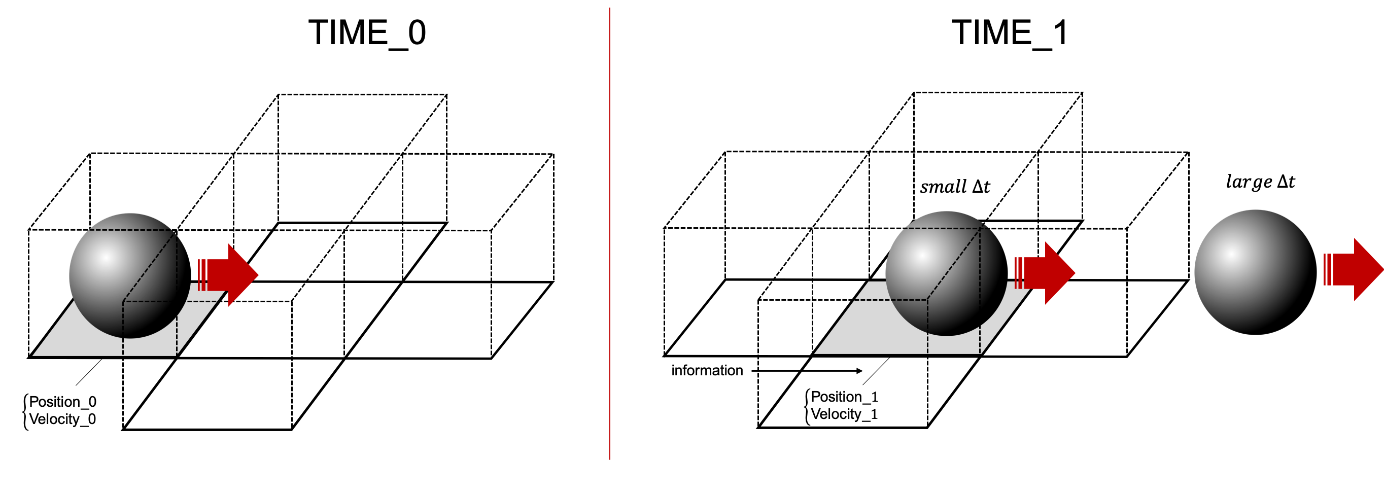 At discrete TIME_0 the left cell contains the information about the ball: its position and its velocity. During the discrete update step, the cell in the centre of the stencil receives this information from the adjoining cell: you could say it ‘knows about the ball’ because these cells communicate. If we update by a discrete step in time Δt, to arrive at TIME_1, the new position and properties of the ball are calculated. If Δt is small, the physical ball moves to a position contained within the distance the information about the ball propagates. If Δt is large, the ball rolls beyond the extent of the numerical stencil. Since the ball has moved faster than the rate of information transfer between the cells, the next cells to be updated simply do not ‘know’ the ball is there. The information is lost so to speak. Properties are not conserved, the physics breaks down, and the whole simulation starts to become unstable.