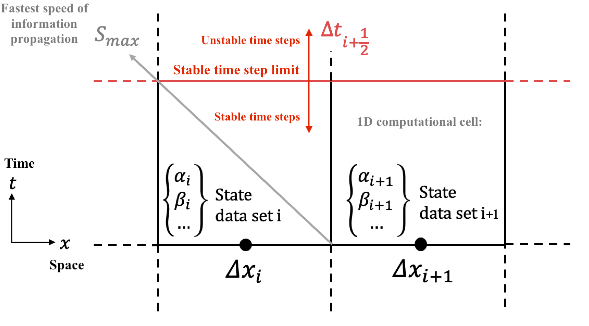 Therefore, for dynamical systems, the CFL condition states: there is a maximum time step for the discrete update of cell data that ensures a simulation is stable. When applied to our core set of conservation equations, this derives a central dependency between: time, the distance between cells in space, and the fastest speed of all information propagation: the speed of light.