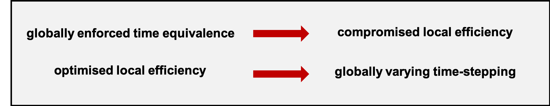 Now, applying the computational optimisation concept, a slight inversion of traditional simulations is proposed: rather than enforcing time to update uniformly across cells (by finding the smallest time-step globally, and restricting all cells by this smallest stable ), global time-step equivalency is not enforced, to therefore permit every cell in space to evolve to its local maximum stable time-step. Therefore, every individual cell is computationally optimised.