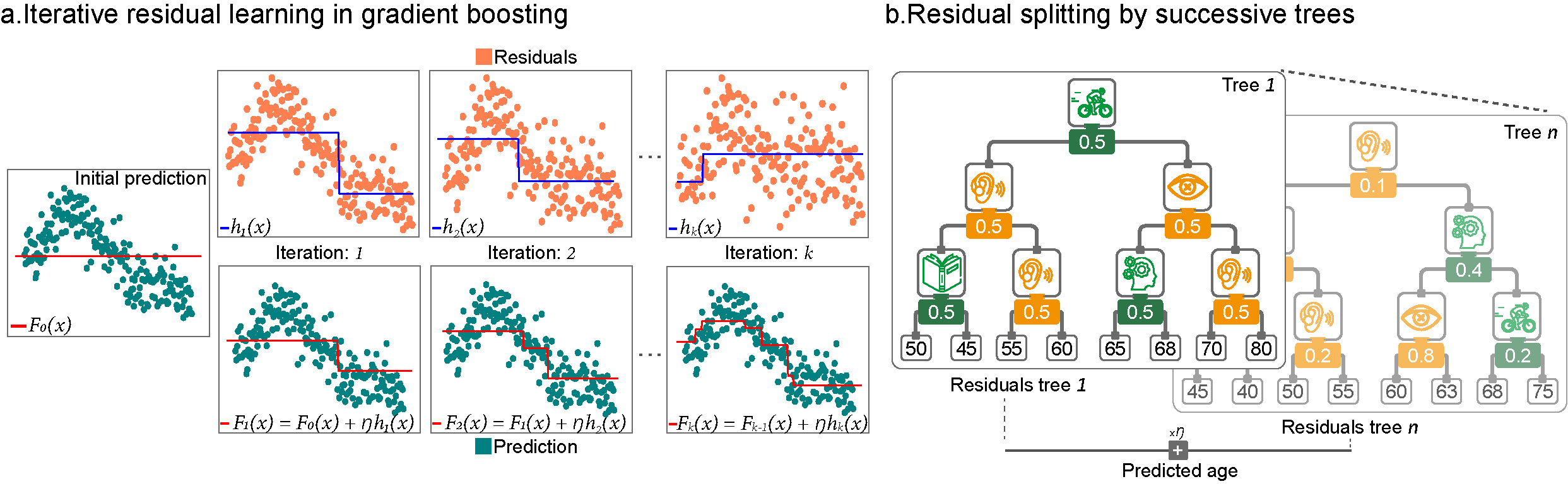 Figure 1. Gradient boosting builds a strong predictive model by iteratively fitting small decision trees to the remaining errors. a) Starting with a constant prediction F0(x) (red line), each iteration computes residuals rk=y-Fk-1(x) (orange) and trains a simple tree hk(x) (blue) to predict them. The updated model Fk(x)=Fk-1(x)+hk(x) (red) gradually improves by adding a scaled correction (h: learning rate). b) Each residual tree splits according to the most relevant features, assigning corrections to leaves. Scaling these corrections ensures that only part of the residual is addressed each time. Subsequent trees refine what remains, producing a high-accuracy ensemble.