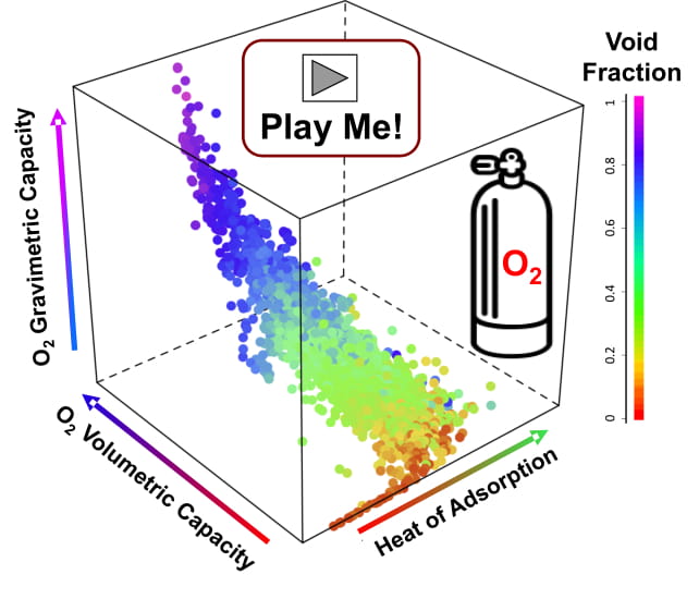 To assist with the analysis of the large generated datasets, we also developed an interactive 5D visualisation tool for producing 1000s of unique structure-property plots to convey the full information obtained on oxygen storage for all the structures under study. This is freely accessible at http://aam.ceb.cam.ac.uk/mof-explorer. This tool allows users to visualise oxygen gravimetric and volumetric uptakes with respect to different combinations of structural properties such as void fraction, pore and window size, heat of adsorption and surface area to better understand their role in oxygen adsorption performance, in up to 5 dimensions simultaneously.