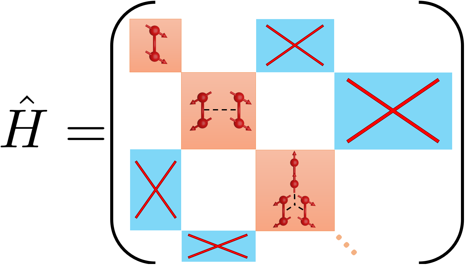 The solution to this problem is a unitary transformation of the non-particle-conserving Hamiltonian to a basis where it is particle conserving. In our computations, we achieve this with the method of continuous unitary transformations (CUTs). The key idea is to not perform the transformation in a single step, but rather to perform it continuously. To understand why this is advantageous, it helps to visualize the unitary transformation as a rotation in a high-dimensional Hilbert space (which it essentially is). By continuously applying infinitesimal rotations over the course of the full CUT, one can change the rotation axis according to the form of the Hamiltonian in the momentary basis. In the CUT framework, one chooses a generator scheme, which defines the way the rotation axis is chosen. The CUT provides a systematic and renormalizing way to find the particle-conserving basis of the Hamiltonian. Mathematically, the non-particle-conserving Hamiltonian has terms which create more excitations than they annihilate and vice versa. In the particle-conserving basis, these terms are zero and all particle-conserving terms are renormalized. This is depicted schematically in Fig. 2 for the spin ladder system, where the elementary excitations are triplons, i.e. S=1 excitations of two coupled spins 1/2, shown as two red spins connected by a red line. Details about the nature of the triplon excitations and how the CUT is performed can be found in the Supplementary Methods of our paper (see link above).