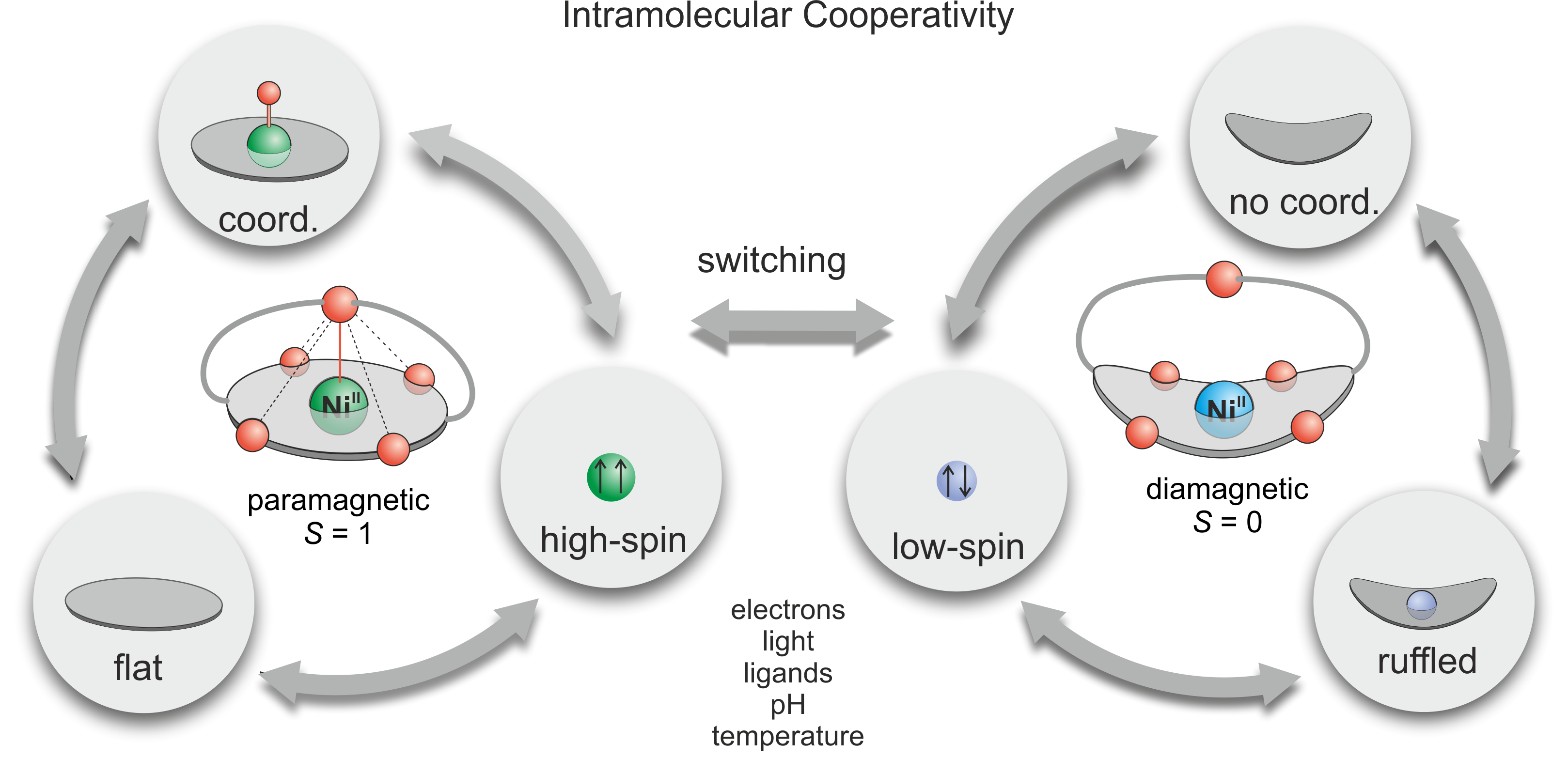 Molecular spintronics provides the ultimate step towards miniaturization of spintronics. It includes the active control over the spin states of individual molecules. Usually, spin lifetimes in isolated organic molecules are very short. Magnetic bistability is a typical solid-state property. The so-called spin crossover materials that would provide more stable spin states usually lose their functionality upon absorption on surfaces while breaking up into individual molecules.The new molecular spin switches (“strapped” Ni-porphyrins) exhibit spin states that are stable at least for several days. The trick is similar to a flip-flop, the simplest bistable electronic circuit in computers, where the output is looped back to the input to generate two stable states. The molecules have three properties that are coupled with each other in a positive feedback loop: geometry (planar p or bent b), coordination (coord. c or non-coord n) and spin state (high-spin h or low-spin l). Thus, the molecules are locked either in one or in the other state (either: pch, or bnl). Switching between the two states is possible by injecting electrons into or releasing electrons from the dz2 orbital of the Ni ion. Filling of the dz2 orbital with two electrons leads to decoordination stabilizing the bnl state, removal of one electron induces coordination and switching to the pch state.