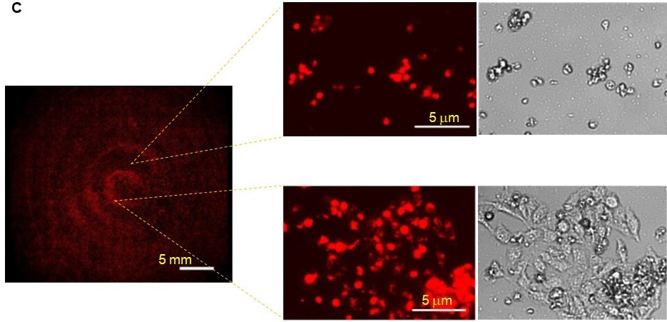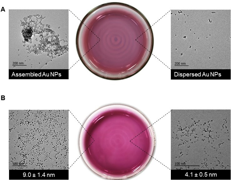 The team demonstrated the enzymatic cascade reaction using Glucose/GOx/HRP/ABTS system. The formation of the compartments was visualized as bluish cyan color (resulting from the oxidation of ABTS to ABTS+.) upon exposure to liquid vibration. The team further expands their approach beyond the molecular level also. We attained predetermined growth and alignment of Au nanoparticles as well as different extent of self-assembly of Au nanoparticles in solution; a deadlock among chemists and materials scientists for several decades (Figure 2A and B). We are also successful in obtaining the preparation of nanoparticle-patterned hydrogels, which contained self-assembled nanoparticles only in selected regions and used them in regiospecific cell growth (Figure 2C).