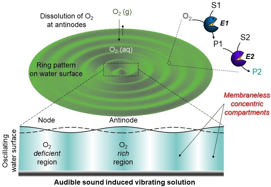 In contrast to this, Dhasaiyan and co-workers from IBS lead by Prof. Kim has developed a strategy to make a new membraneless concentric compartment, so-called “Concentriosome”. The team has recently reported a new way to control the patterns in out-of-equilibrium systems in 2020.[3] We now found that the solution was transiently separated and not mixed together for a certain period of time due to the node region of the wave and an invisible wall blocked different layers and hence the solution becomes naturally compartmentalized (Scheme 1).