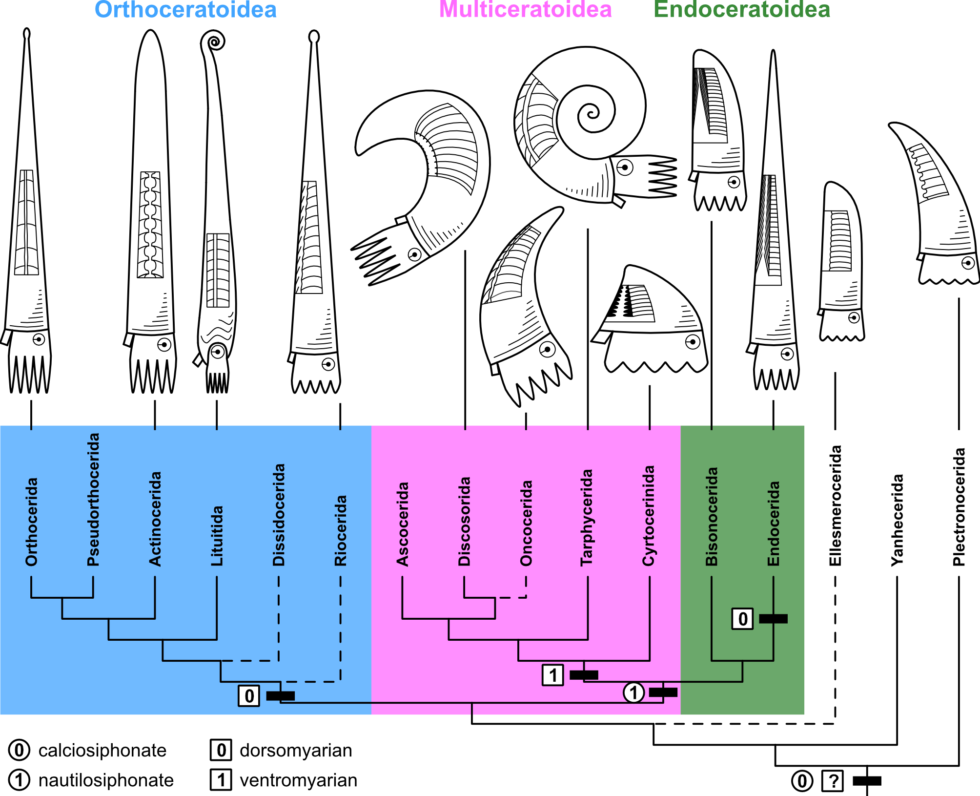 The big question is here: how did these diverse forms evolve and how are all these groups related to each other? In the past, there have been multiple attempts to solve this, and different evolutionary scenarios have been proposed. The problem was that different researchers focussed on only few, but different characters to reconstruct their evolutionary trees and thus reached different, often contradicting results. In our study, we took a different approach by collecting a large amount of morphological data and analysing them quantitatively with state-of-the-art methods, i.e., Bayesian inference and the so-called Fossilized Birth-Death model. According to our results, early cephalopods diverged quite early into three major groups (Fig. 3): The Orthoceratoidea (mostly slender straight shells with calcified deposits within their chambers and siphuncles), the Multiceratoidea (very disparate shell shapes and thus hard to define, but generally ventrally enlarged muscle attachments and empty siphuncles) and the Endoceratoidea (sometimes very large straight to slightly curved shells, with characteristic conical deposits called endocones within their siphuncles).