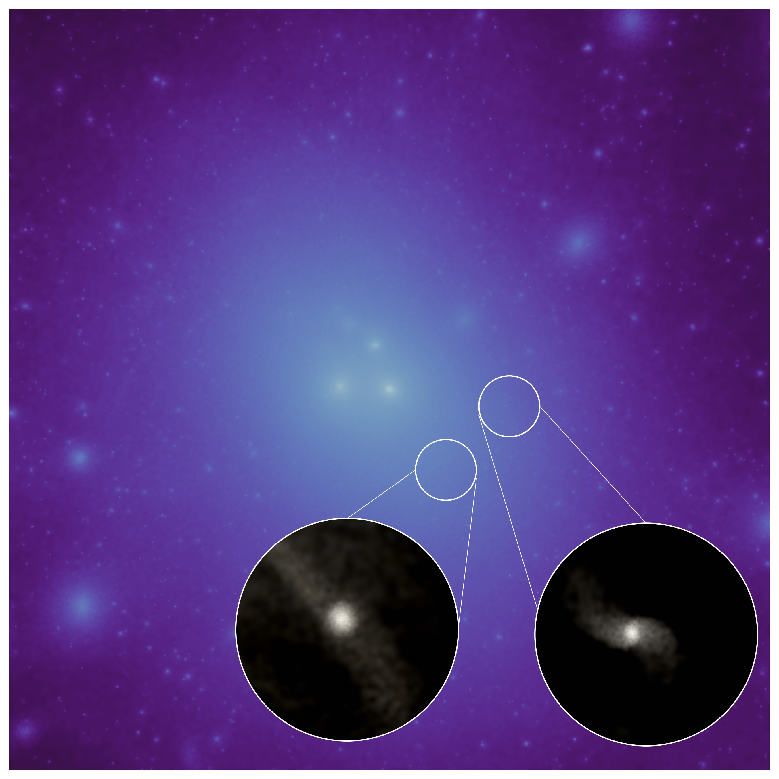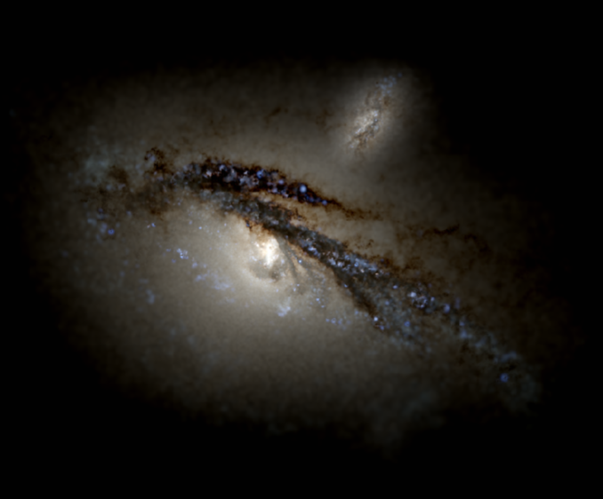 How, then, are these dark-matter deficient galaxies formed? Idealised numerical experiments, like those conducted by Andrea Macciò and collaborators, suggest that close encounters may play a pivotal role (see their 2021 paper, plus similar papers by other groups). Our work suggests that two conditions must be met: (1) a satellite must be interacting with a neighbour with approximately 1,000 more mass in stars and (2) the satellite must pierce within 5 percent of the dark-matter halo radius of the host. In general, satellite galaxies face one of two fates: either they assimilate onto the larger neighbour or are completely destroyed by the gravitational field of this massive host. However, our galaxies decided to follow a third alternative path: to confront their Goliath multiple times. Some of them cross the stellar component of their massive neighbour up to 9-14 times! But they pay a price: they end up losing most of their dark matter. Figure 3 shows one of our simulated massive galaxies being pierced by a satellite that eventually becomes a dark-matter deficient galaxy.