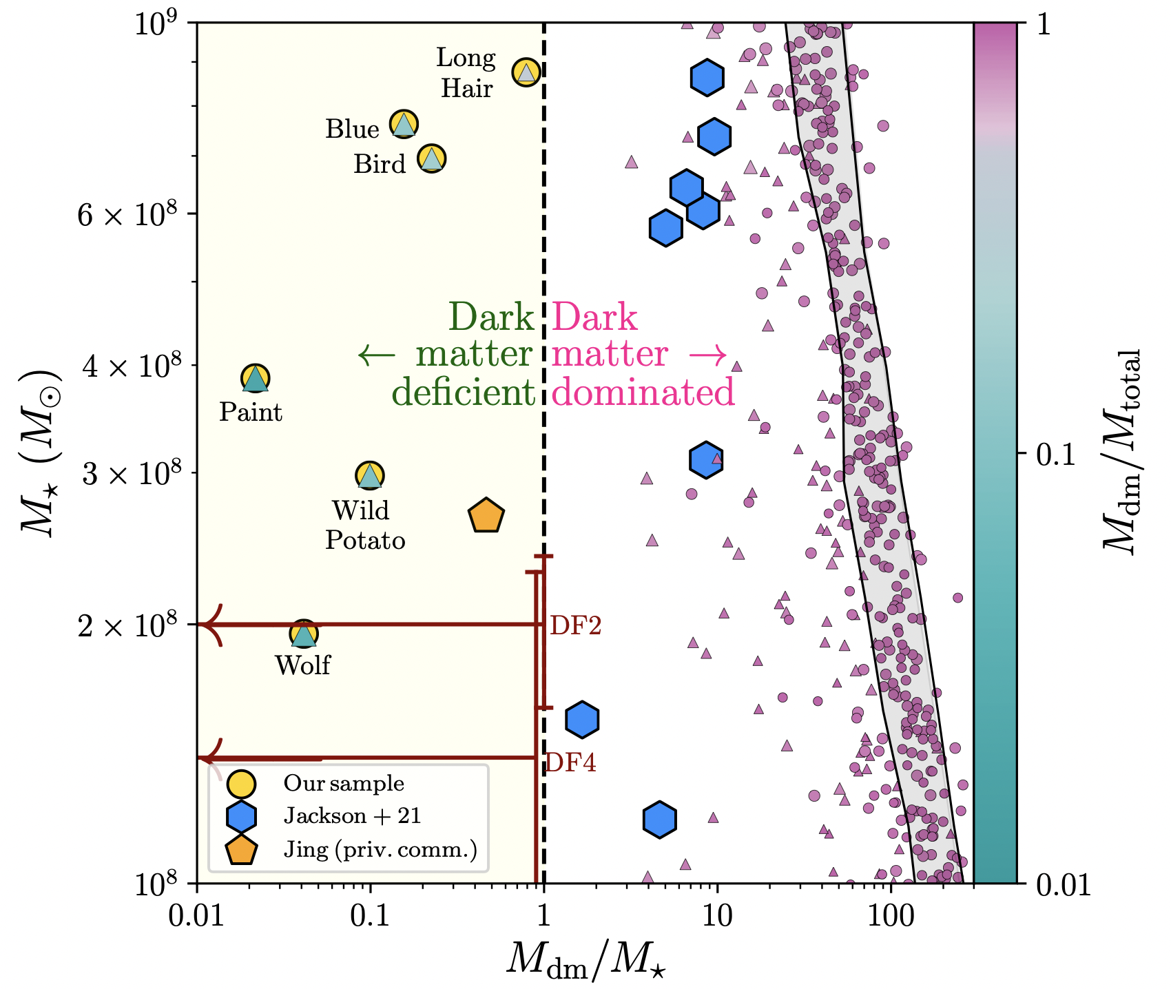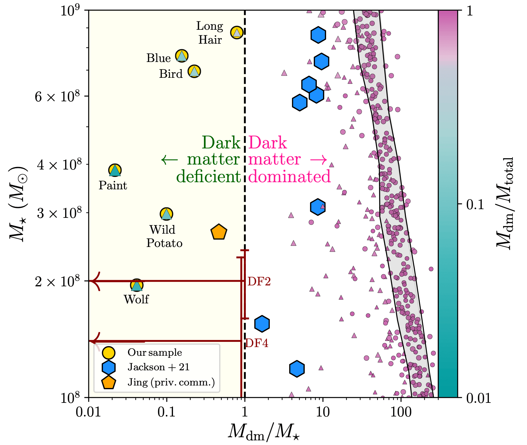 Tempting as it might be to feel über-competitive, it is paramount to acknowledge the important contributions from other research groups around the world. After all, we are all together in this extraordinary endeavour to understand how galaxies form! In their 2021 paper, Ryan Jackson and collaborators used the NewHorizon cosmological simulation to show that the gravitational field associated with massive hosts can tidally dilute satellites off of their dark matter, explaining why the blue hexagons in Figure 2 are to the left of their average counterparts at the same stellar mass (the gray band). Unfortunately, none of Ryan's low-mass galaxies (with stellar masses below 1 billion solar masses) are able to cross into the dark-matter deficient regime (the yellow rectangle). They do report three galaxies with dark-matter-to-stellar mass ratios below unity, but these are over an order-of-magnitude more massive (in stars) than the two observed dark-matter deficient galaxies. Yingjie Jing and collaborators also found an interesting object in their 2019 paper. Unfortunately they report quantities that cannot be directly compared with existing observations. I asked him to prepare the datum shown in Figure 2 (orange pentagon), which he generously shared with us. This galaxy was found in a high-resolution version of the EAGLE simulation (EAGLE-highres), which leads me to believe that the TNG-50, the highest-resolution run within the IllustrisTNG series, might also possibly host similar objects. Unfortunately, the EAGLE-highres simulation is not able to re-create galaxies with dark-matter fractions as low as those found in FIREbox (or with stellar masses and dynamics in line with observations). Being able to create such extreme objects in such a large-volume simulation is truly staggering.