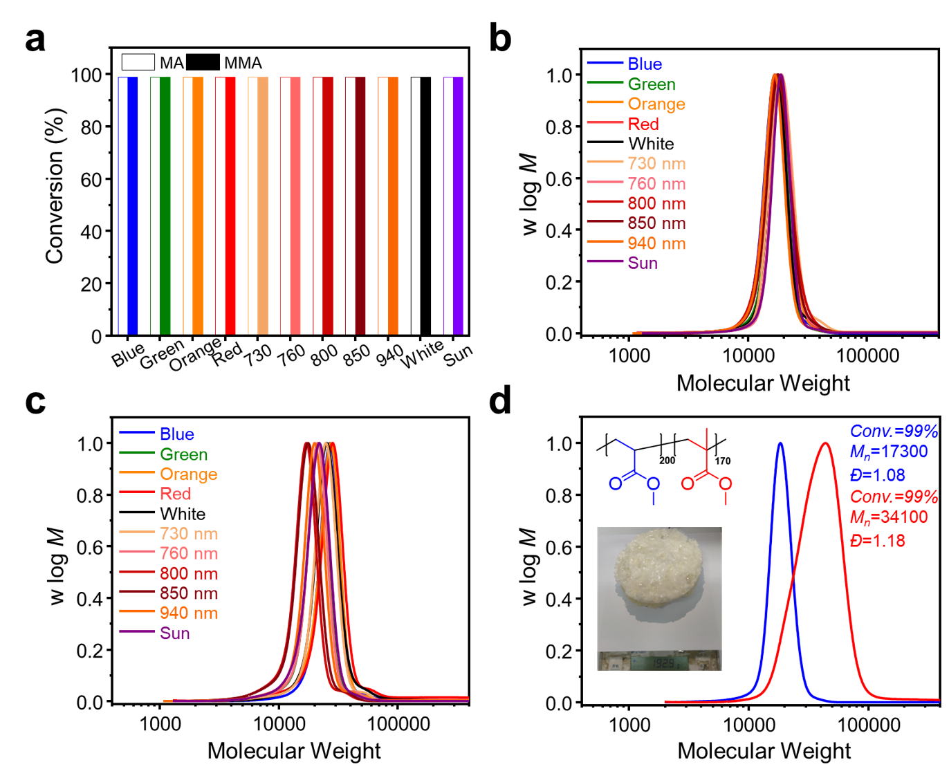 Fig. 2 (a) Monomer conversions of MA and MMA using PPh3-CHCP as photocatalysts under blue, green, orange, red, white, 730 nm, 760 nm, 800 nm, 850 nm, 940 nm, and sunlight irradiation respectively. Experimental details are provided in the supplementary materials. SEC traces of synthesized (b) PMA and (c) PMMA using PPh3-CHCP under series light irradiation. (d) SEC traces of 200 mL scale of PMA macroinitiator (in blue) and 400 mL scale of PMA200-b-PMMA170 copolymer (in red, and 192.9 g block copolymer was obtained finally) upon in situ chain extension showing high chain-end fidelity and successful chain extension. The polymers were synthesized using PPh3-CHCP in the absence of external deoxygenation.
