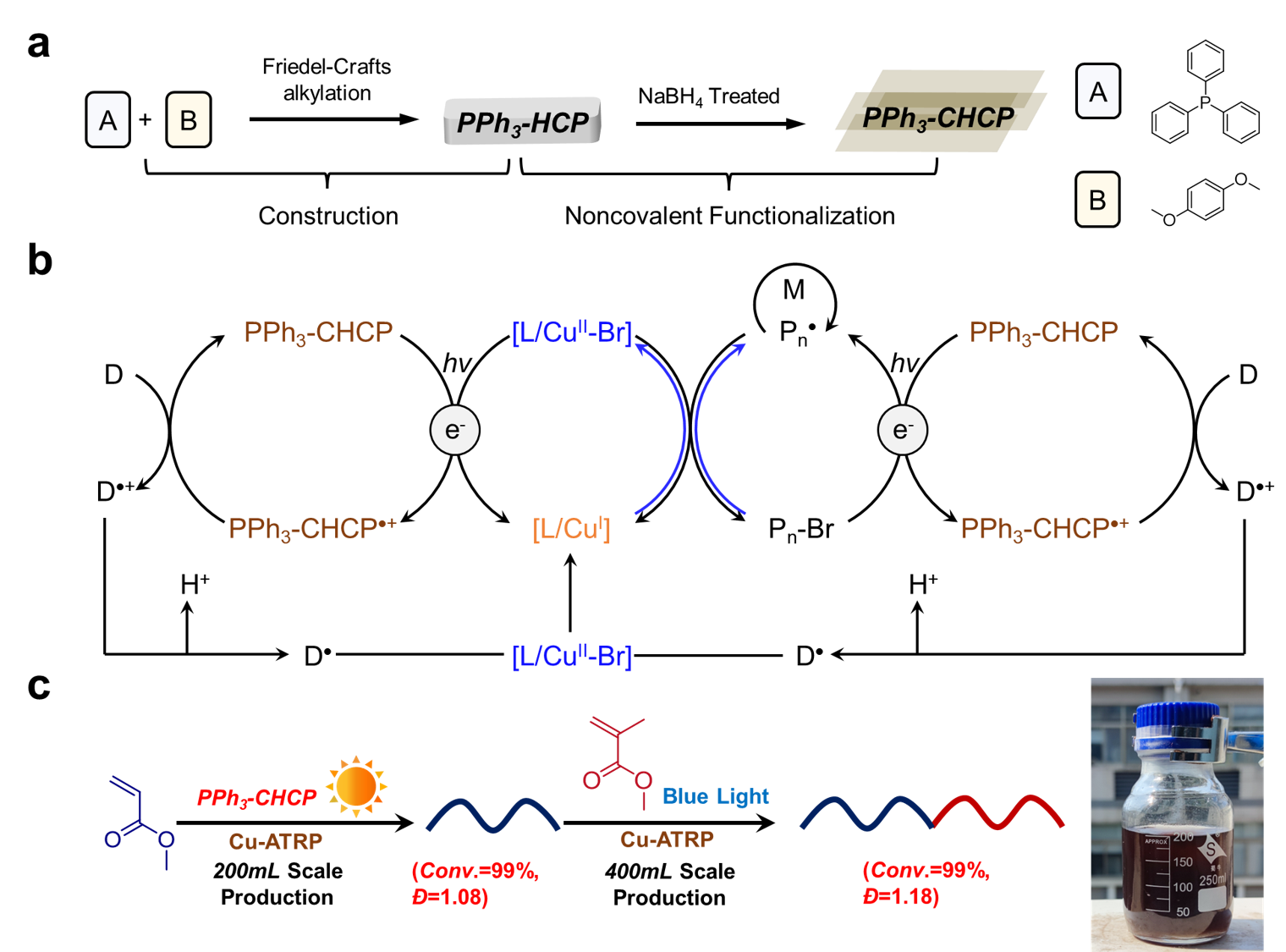 Fig. 1 Development of photocatalyst for large scale sunlight-driven Cu-ATRP. (a) Strategy for the fabrication of PPh3-CHCP photocatalyst. (b) Generation of ATRP activators via photoredox reactions. (c) Photoinduced Cu-ATRP in the presence of PPh3-CHCP (inserted photo: 200mL reaction scale of PMA under sunlight irradiation).