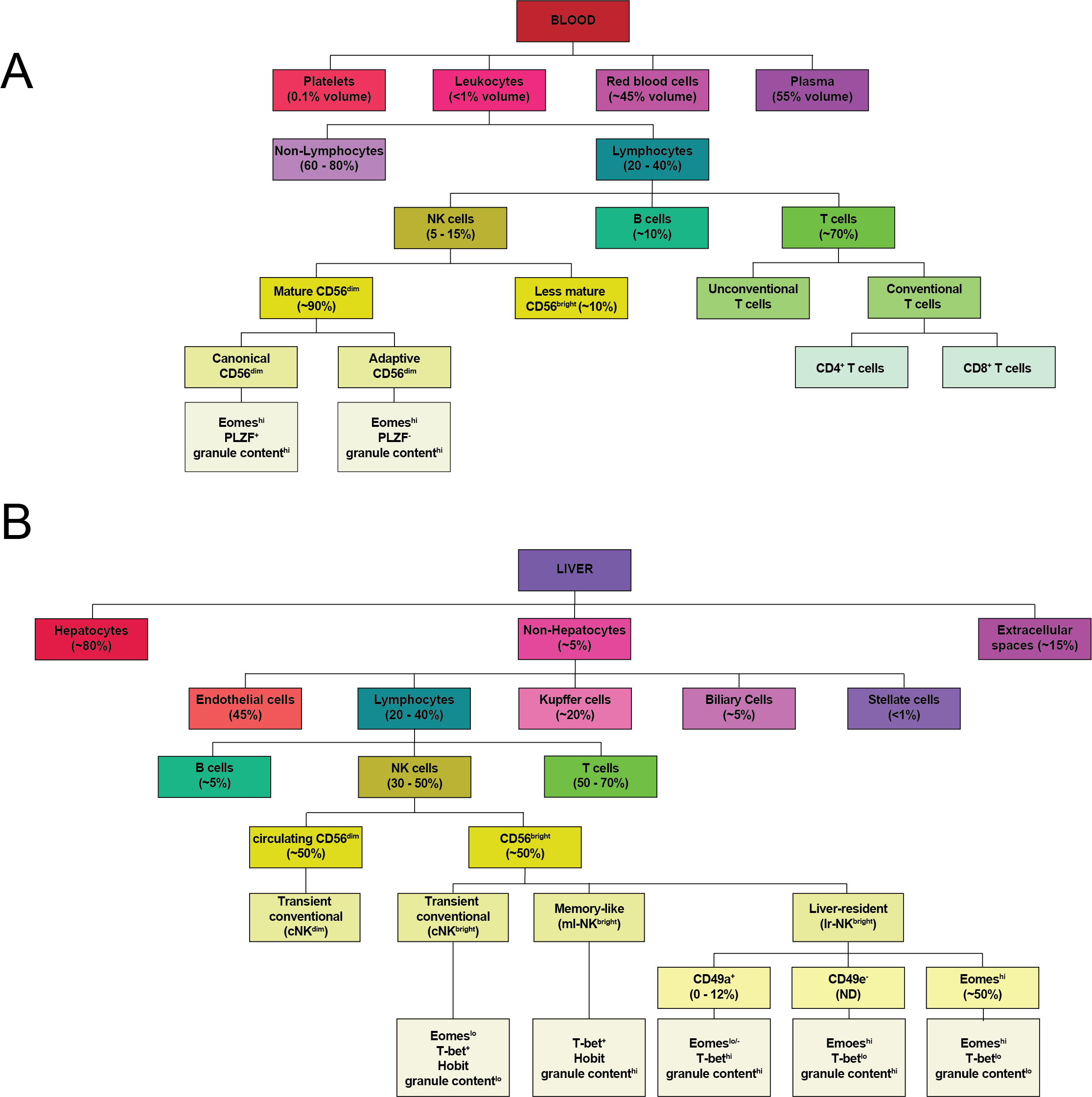 Figure 1: Comparison of cell composition of blood (A) and healthy liver (B). (A) Blood components are listed in the first layer, including plasma (55% by volume), red blood cells (45% by volume), platelets, and leukocytes (< 1%). Leukocytes (another name for white blood cells) can be further classified as non-lymphocytes (60-80% by number, e.g., neutrophils, monocytes, eosinophils, etc.) and lymphocytes (20-40% by number, e.g., T, NK, and B cells). NK cells account for around 10-20% of the total lymphocytes by which is divided into two main subsets: 90% of mature CD56dim and 10% of less mature CD56bright 5. The CD56dim subset in the peripheral blood has high granule contents and is composed of canonical and adaptive populations 6. (B) Liver is the frontline immune organ. Hepatocytes constitute about two thirds of total cell population in the liver 7. The average human liver contains about 1010 lymphocytes. About 50% of hepatic lymphocytes are NK cells (30-50%) 8. These liver NK cells are equally divided into CD56dim and CD56bright. The CD56bright liver NK cells can be classified as liver-resident (lr-NK), memory-like (ml-NK), and transient conventional (cNK) NK cells 9. Approximately 50% of the hepatic CD56bright NK cells is lr-NK that is further subdivided into CD49a+, CD49e-, and Eomeshi subsets, each subset with a distinct function 10-12. ND, no data. Modified from Racanelli et al 7 and with the help from Minh Ma. |