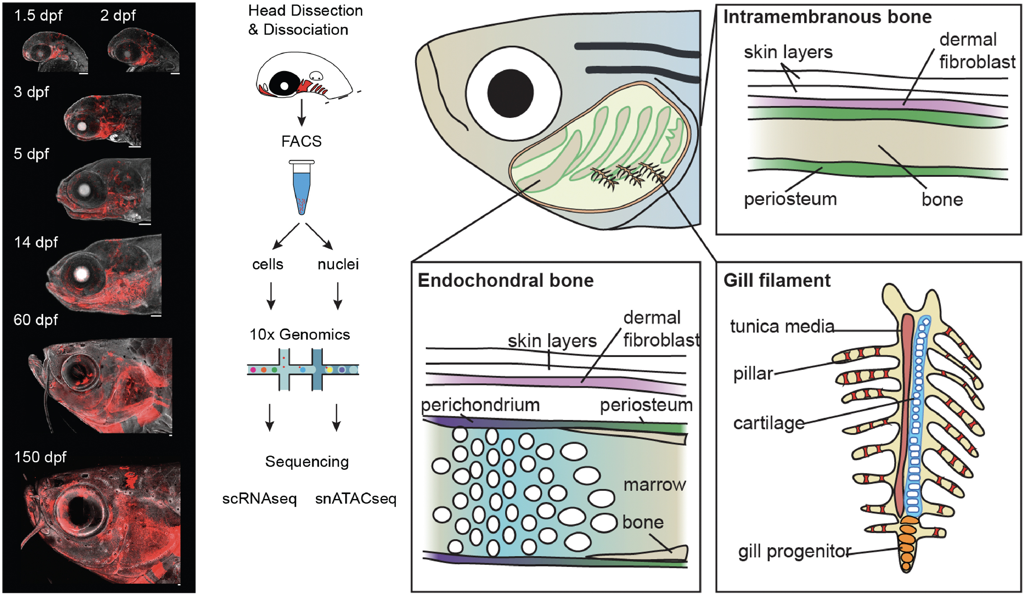 Most tissues in our faces, including bones in our cheeks, the cartilage in our noses, and teeth in our mouths, were formed from a unique cell population called the neural crest. Their unusualness lies in their origin, ability to widely disperse in the embryo, and potential for forming a diverse range of anatomical structures. More than 150 years after their discovery, we still do not know the full spectrum of neural crest derivatives or how they form. In our latest paper (“Lifelong single-cell profiling of cranial neural crest diversification in zebrafish”), we tried to answer these questions using single-cell profiling and bioinformatic approaches.