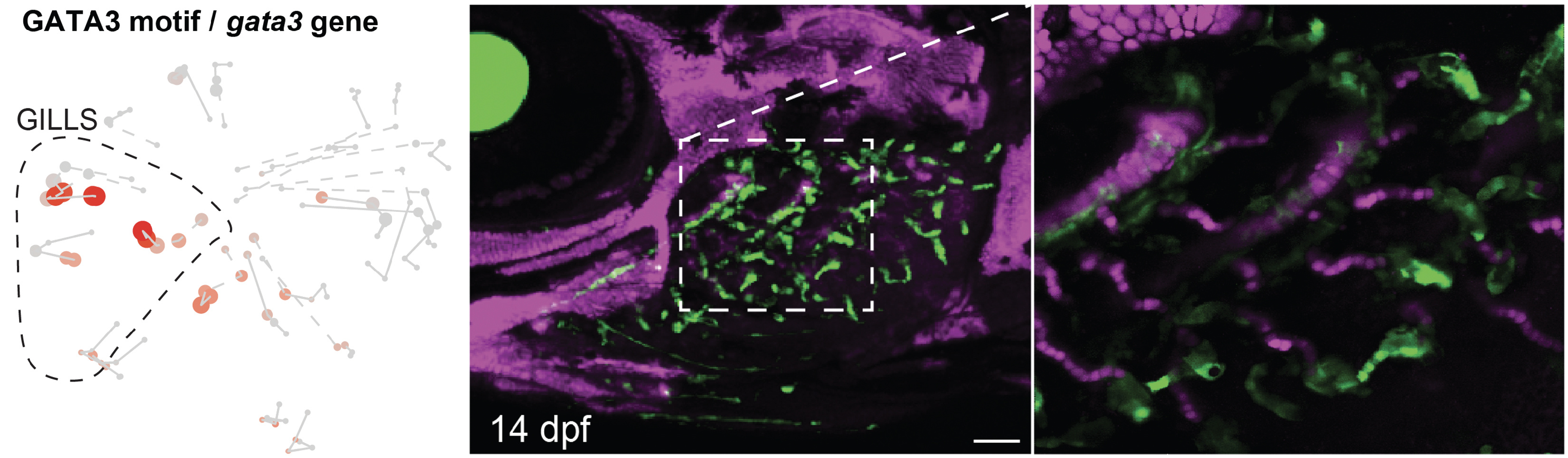 Activity of GATA family members in Constellations analysis and within a zebrafish embryo. Right, fluorescent images show the activity of a gata3 DNA control region (green) in tissues of the gill, including specialized gill cartilage (magenta).