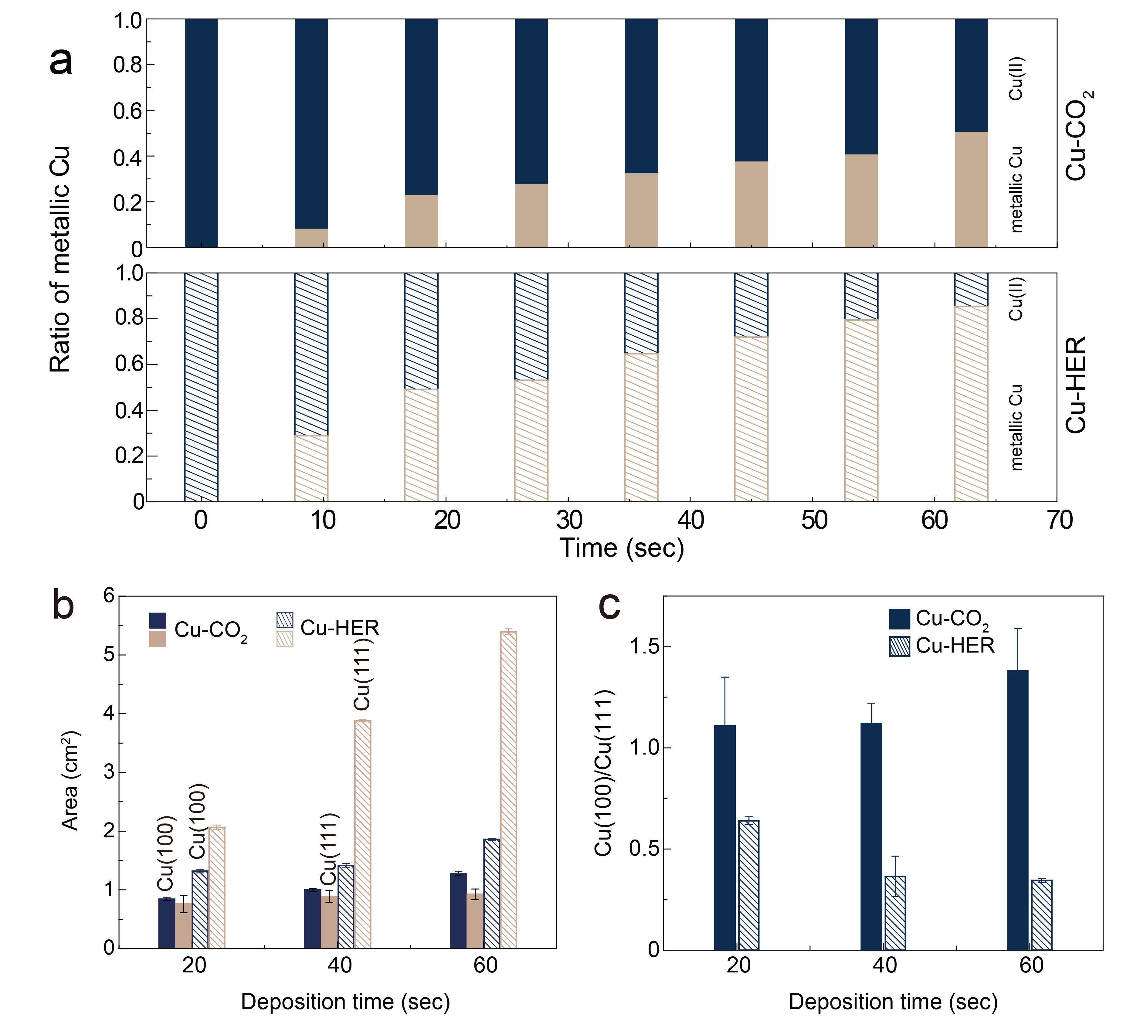 Figure 2. Analysis of the catalyst formation and the surface structures. a The ratio of metallic Cu to Cu precursor over the course of catalyst formation. b, c The surface area and ratio of Cu(100) and Cu(111) facets.