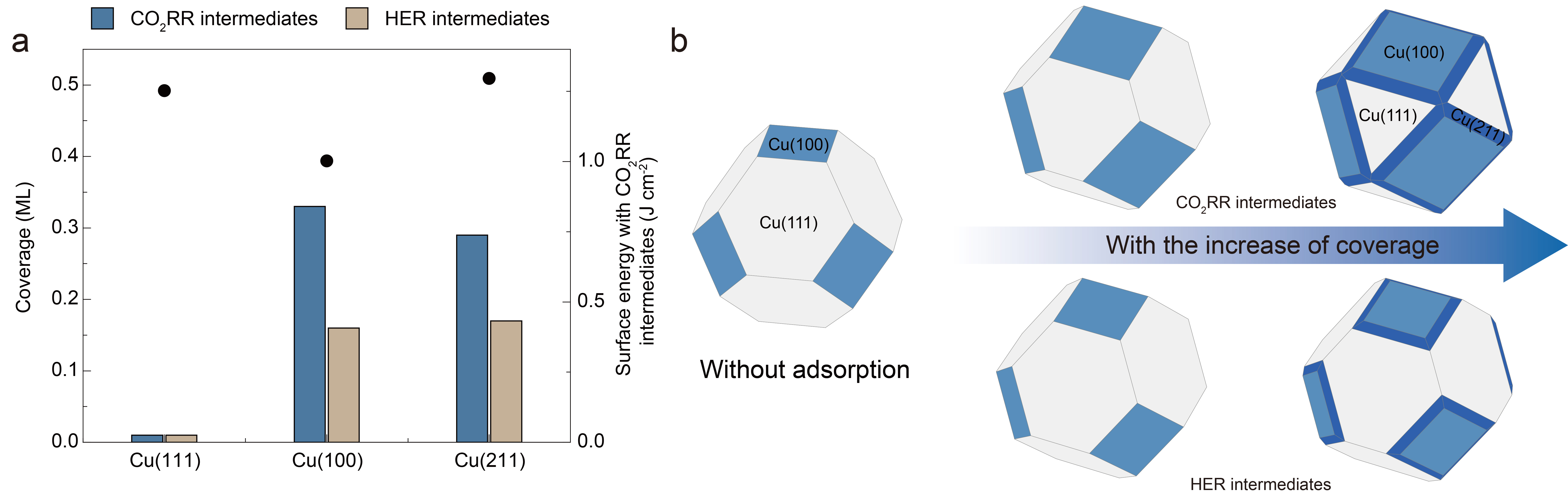 Figure 1. Wulff construction clusters of Cu showing the coverage of CO2RR and HER intermediates. a Calculated intermediate coverage and corresponding surface energies of Cu(111), Cu(100) and Cu(211) facets. b Wulff construction clusters of Cu without and with adsorption of CO2RR and HER intermediates.