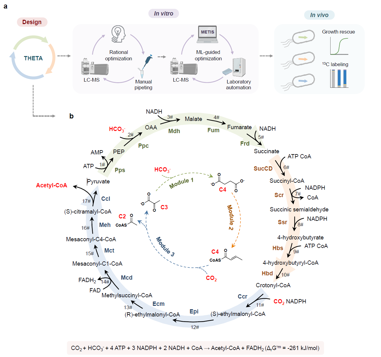 Fig. 1. The THETA cycle and its realization. (a) Overall strategy used in this work to establish the THETA cycle. The THETA cycle was designed in three modules, constructed in vitro, optimized through rational approaches and machine learning, before its three modules were implemented in E. coli. (b) Scheme of the THETA cycle. Inner circle: simplified scheme of the THETA cycle, consisting of 3 pathway modules. Outer circle: detailed scheme of the THETA cycle.