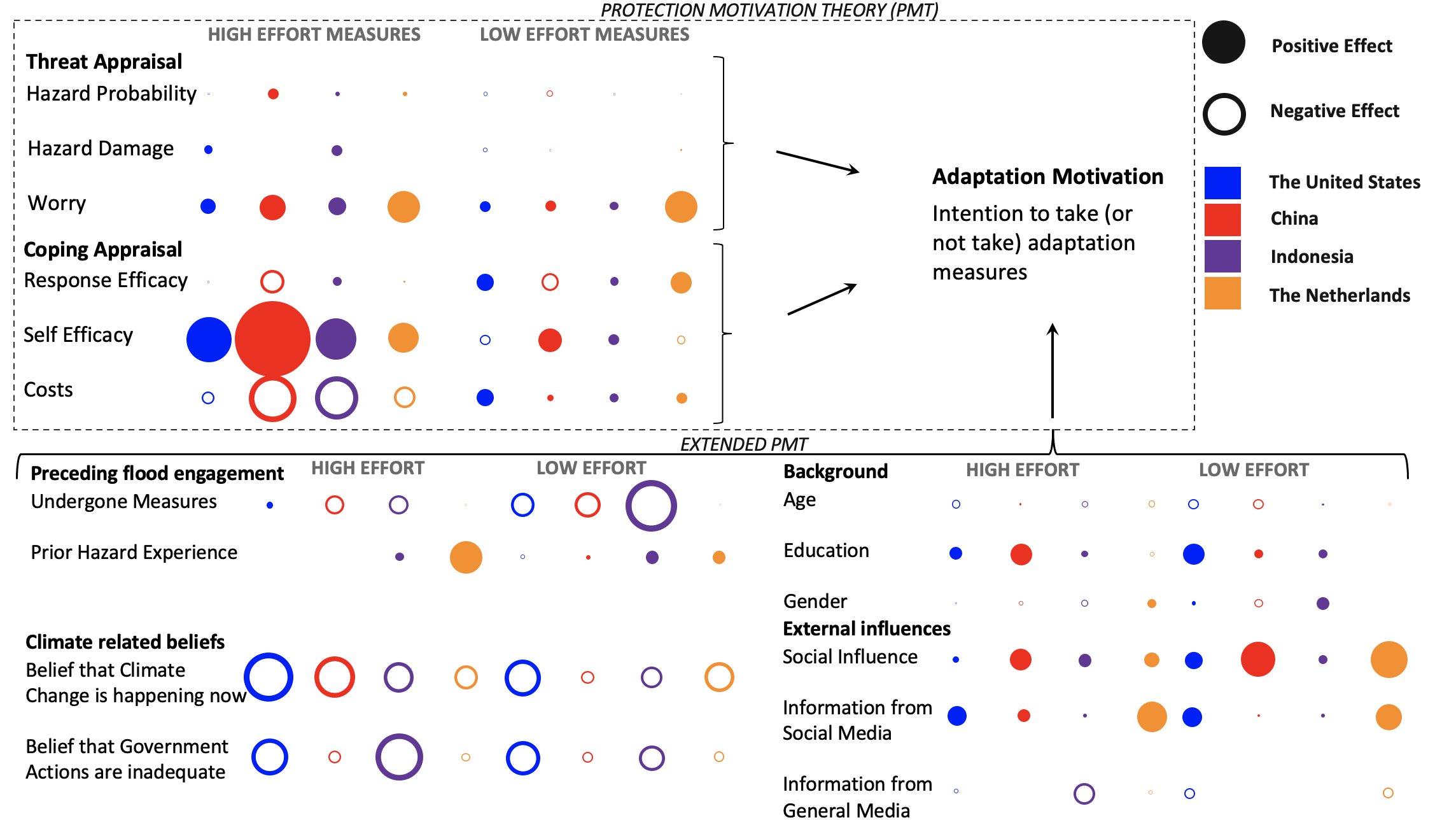 To address this gap in knowledge, our ERC lab launched a longitudinal survey in four diverse countries across the globe: the United States, China, Indonesia, and the Netherlands (N>6000). In our analysis, we compare 16 different factors commonly utilized to motivate and estimate household adaptation intention across the four countries. We distinguish between two types of adaptation: High Effort measures (8) involve structural, usually irreversible modifications to one’s home, and Low Effort measures (10) less intensive non-permanent protection and communication actions.