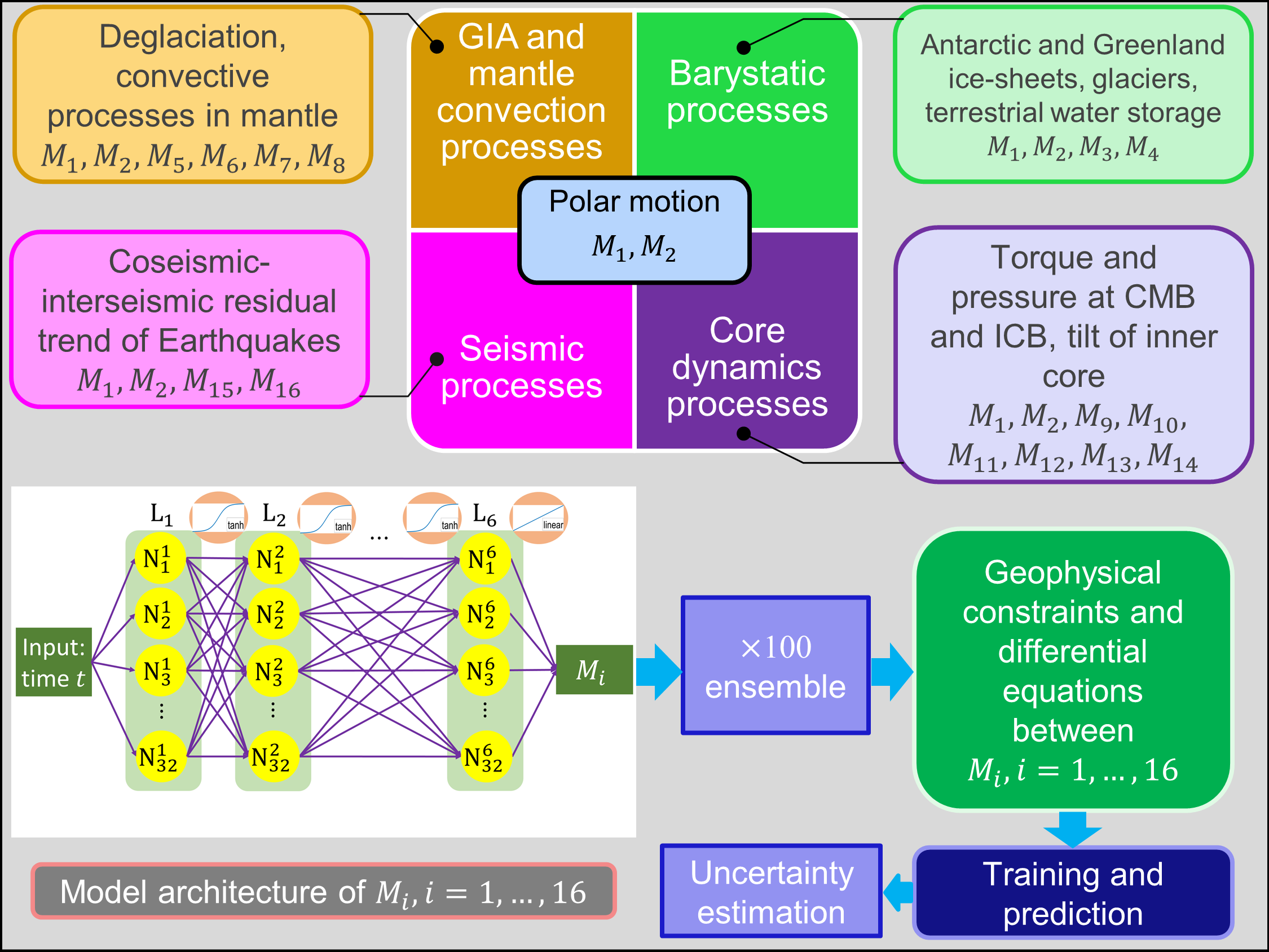 The underlying method behind the paper is based on machine learning. Specifically, the so-called physics-informed neural networks (PINNs) have been used. PINNs are powerful mathematical tools that can accurately model and predict a dynamic system. They take advantage of the capabilities of neural networks (including the analysis of linear and nonlinear relationships between different processes) as well as the prior physical information. The result is an algorithm that obeys the physical laws and has exceptional prediction capability. Based on this, the authors of the study have been able to unravel the causes of long-period polar motion (see Figure 2 below).