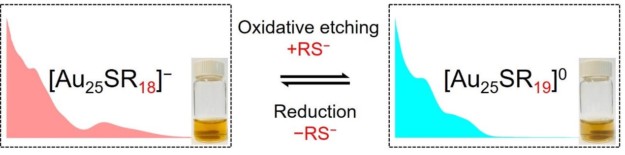 Our group has also put a lot of efforts into realizing the size control of water-soluble metal NCs (See more information on our website: https://blog.nus.edu.sg/xiegroupnus/). However, in one of our recent studies, we found that the size of metal NCs (n value) is not the certain prerequisite of the number of ligands on their surface. Instead, a single surface ligand can be precisely added and eliminated on Au NCs surface, as demonstrated in [Au25SR18]−, which is the flagship cluster of AunSRm family. In our paper, we demonstrate the reversible conversion between the water-soluble [Au25SR18]− and [Au25SR19]0 an oxidative etching/reduction cycle (Figure 1).