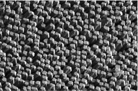 One of the inspirations for this work was the different patterns and structures in biological materials. Here is an electron micrograph of calcite crystals packed in the shell of a blue mussel. The width of the image is 100 micrometer (photo credit Pezhman Mohammadi).